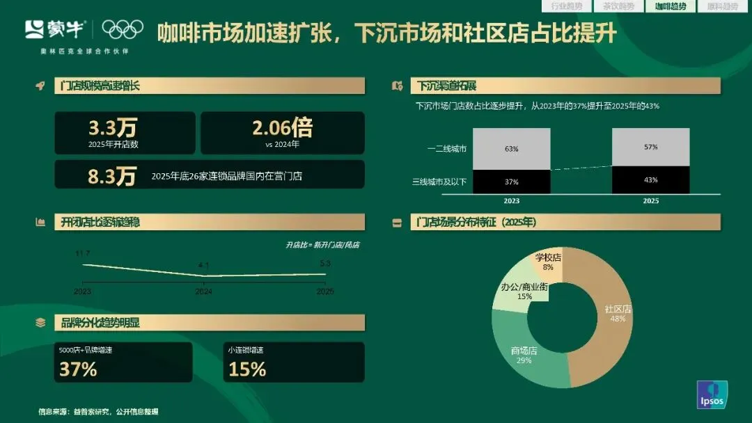 咖啡市场的增长,始终伴随着渗透率的持续提升和场景的不断下沉。2025 年,咖啡下沉市场门店数占比从 2023 年的 37% 提升至 43%,门店场景分布中,社区店占比达到 48%,成为品牌布局的核心场景。