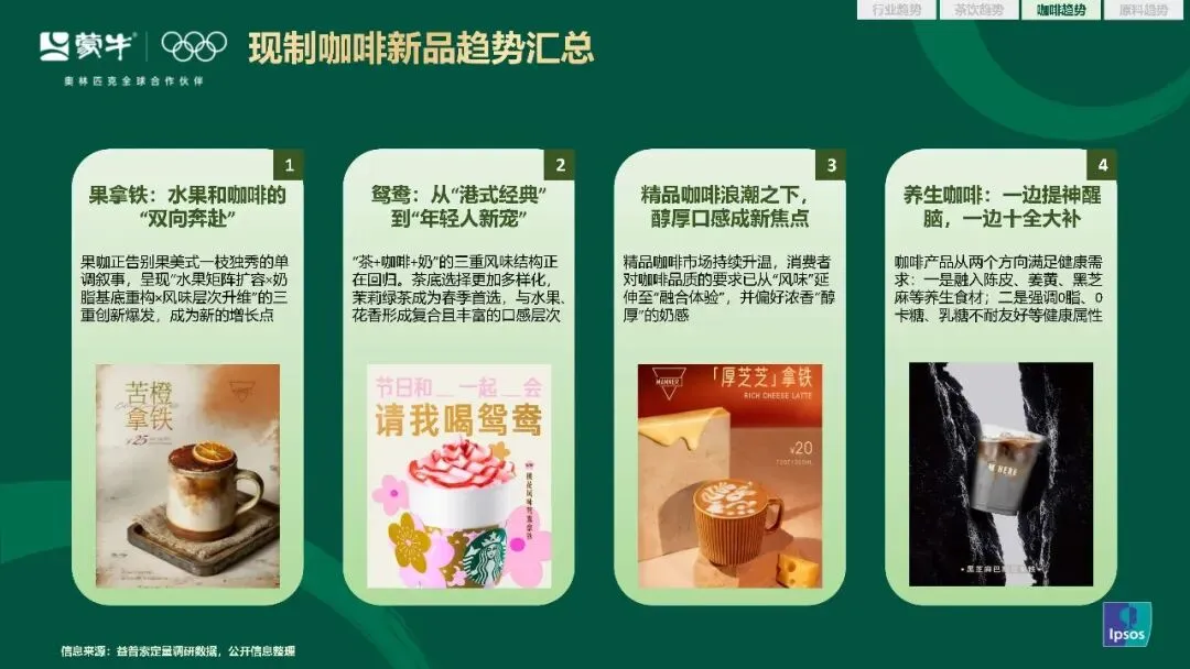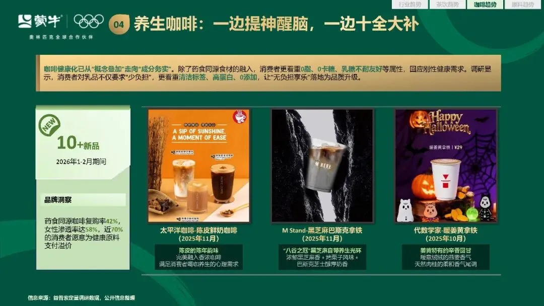 产品创新上,果咖赛道告别了果美式一枝独秀的格局,果拿铁凭借水果与奶香的平衡融合,成为新的增长极。茶咖融合的鸳鸯品类重新回归大众视野,茶底的选择更加多元,实现了提神、解腻、舒缓的多重功能协同。消费者对咖啡的品质要求,已经从单一的风味延伸到整体的融合体验,浓香醇厚的奶感成为新的消费焦点。2026 年春季,醇厚咖啡成为增速最快的子赛道,同比增长 28%,高乳脂产品占比提升至 38%。养生咖啡的创新也从概念叠加走向成分务实,药食同源食材的融入,叠加 0 脂、0 卡糖、乳糖不耐友好等健康属性,让养生咖啡的复购率达到 42%,女性渗透率高达 58%。