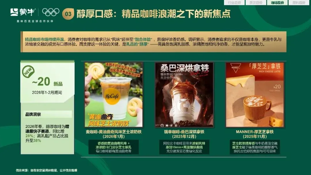 奶盖的创新呈现出两条清晰的路径,茶饮端通过视觉效果强化社交传播属性,咖啡端则聚焦风味打造清晰的记忆锚点。咸味乳品成为茶饮创新的新赛道,也为咖啡的风味表达带来了新的可能。含乳小料在茶饮产品中,逐步走向甜品化和代餐化,健康化乳品则持续向清洁标签、高蛋白、低负担的方向演进,精准回应不同消费群体的细分需求。