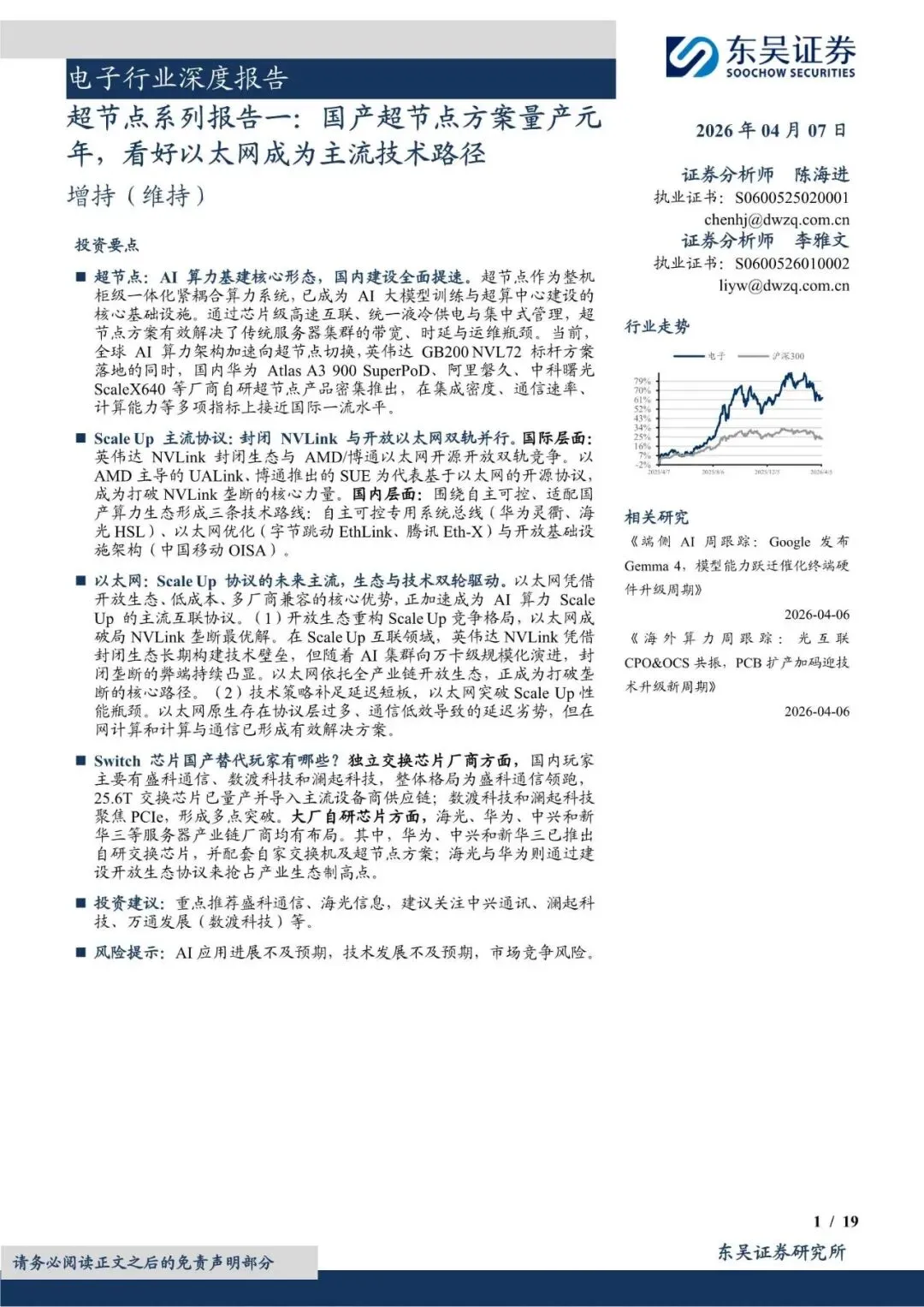 回复暗号:电子行业深度报告:超节点系列报告一,国产超节点方案量产元年,看好以太网成为主流技术路径-260407-东吴证券-19页