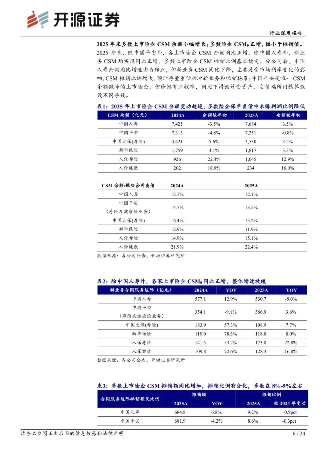中国平安 CSM 余额微降,但降幅较 2024 年有所收窄。除中国人寿外,各上市