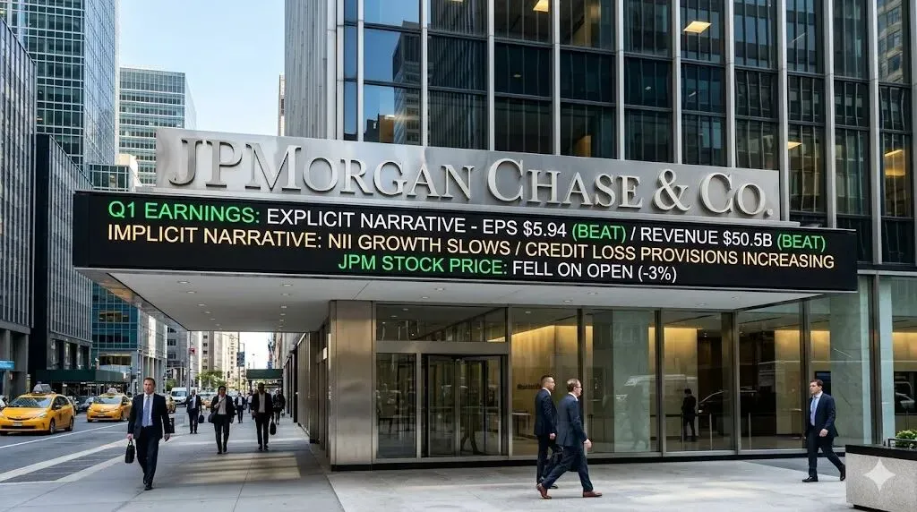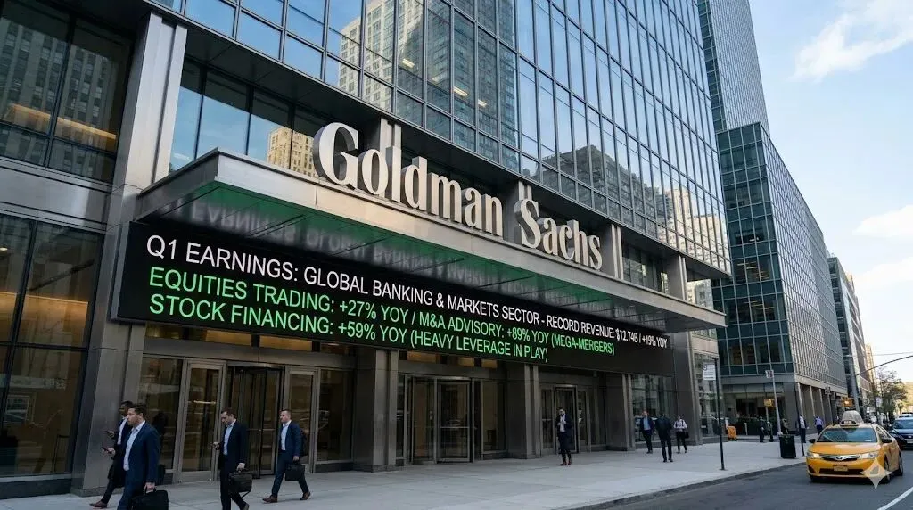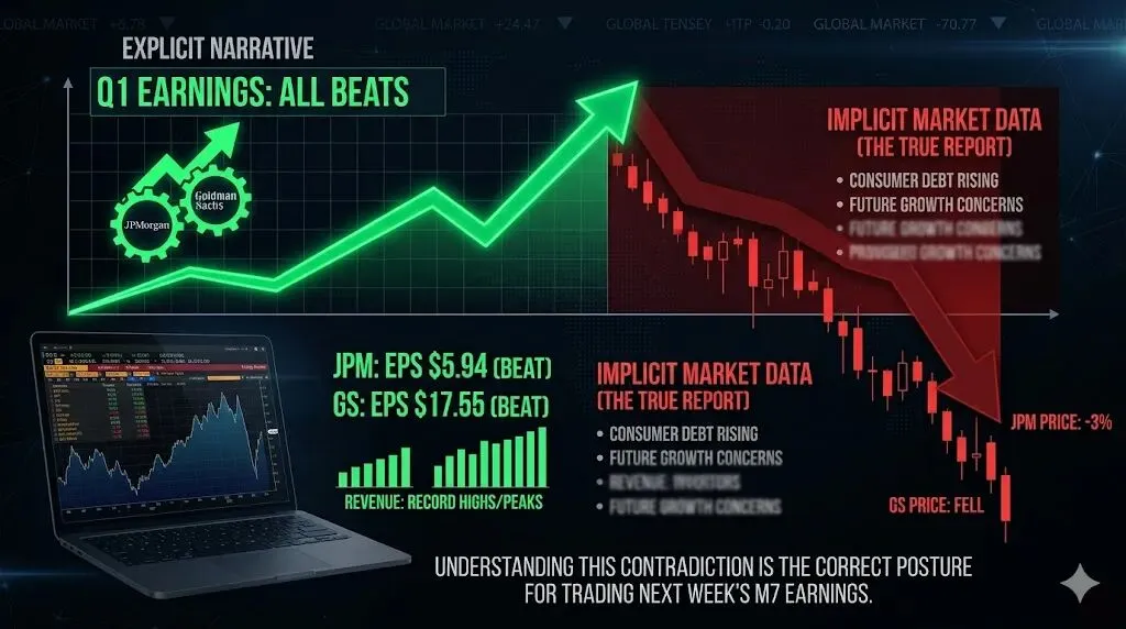 本周一二两天,华尔街最能赚钱的两家机构先后交卷:高盛周一披露,摩根大通周二跟上。两份财报,EPS全部大幅超预期,收入全部创历史新高或接近历史峰值。按理说,应该涨停庆祝。摩根大通EPS报$5.94,超预期$5.46;营收$505亿,超预期约$13亿。股价开盘跌近3%。高盛EPS报$17.55,大幅超过华尔街预期的$16.40附近。 也跌了。这个"超预期+下跌"的组合,不是市场犯蠢,而是市场在读一份你没注意到的隐性报告。把这份隐性报告读懂,才是交易下周M7财报的正确姿势。一、高盛:华尔街的欲望已经重新点燃