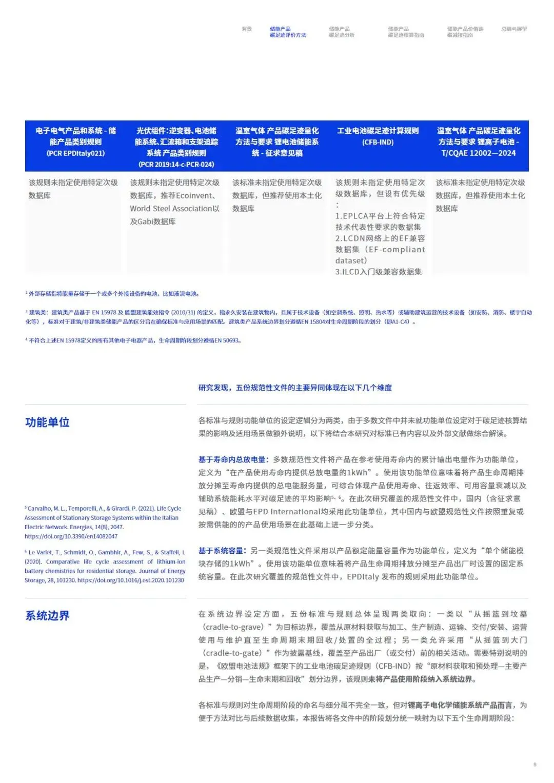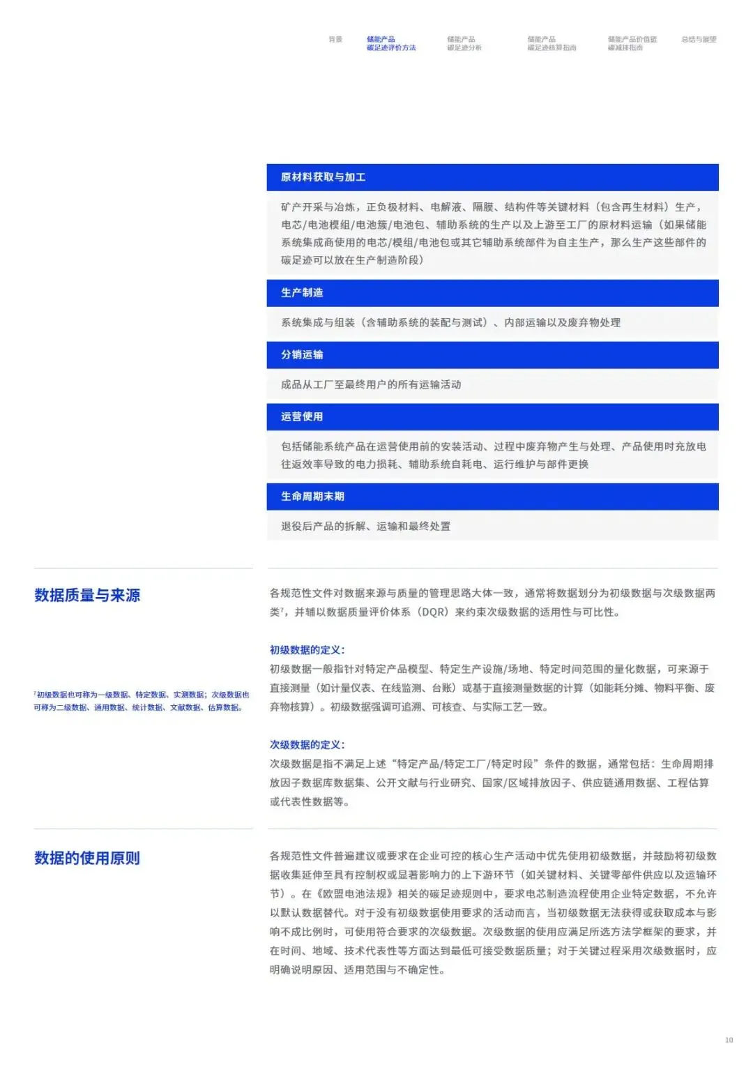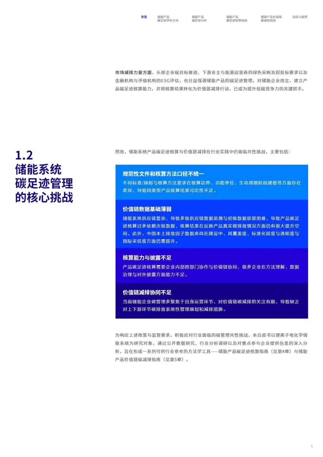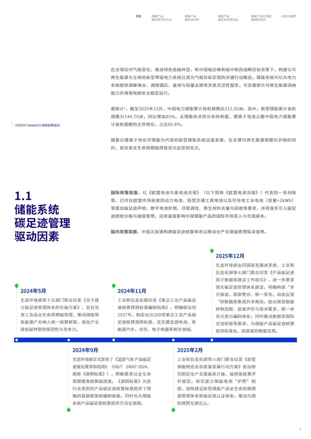 在全球碳中和转型与新型电力系统建设进程中,储能作为支撑可再生能源规模化应用的关键设施,其产业规模快速扩张,全生命周期碳排放管理已成为行业合规与竞争力提升的核心议题。受《欧盟电池法规》、国内碳足迹管理体系建设等政策驱动,叠加下游绿色采购与ESG评估要求,储能企业亟需建立标准化碳足迹核算能力并推进价值链协同减排。当前行业仍面临核算标准口径不一、供应链数据追溯困难、核算与披露能力不足、价值链减排协同薄弱等挑战。本报告以锂离子电化学储能系统为研究对象,系统梳理储能产品碳足迹评价标准与方法,结合典型案例剖析碳排放热点与核算差异,提供全流程碳足迹核算操作指南,并覆盖原材料、生产、运输、使用、回收全生命周期的减排技术与路径,为储能企业开展碳管理、落实减排行动、满足国内外合规要求提供务实参考,助力储能行业实现低碳高质量发展。
