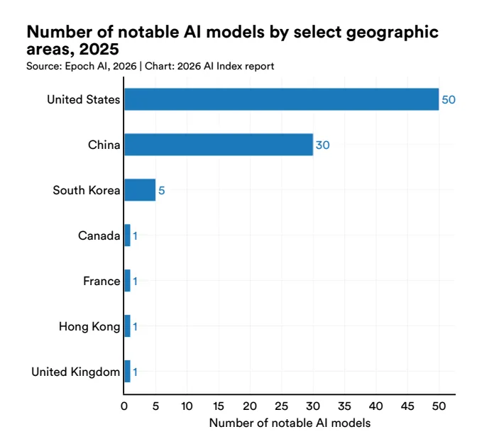 2025年,全球人工智能研发的产业主导趋势进一步强化。在具有重大影响力的人工智能模型中,产业界贡献了超过90%的成果,学术界的独立产出占比持续降低。从地理分布看,中美两国重要模型的发布量占据全球绝大部分模型研发产出。欧盟和英国虽在政策层面积极布局,但在模型产出数量上仍与中美存在显著差距。