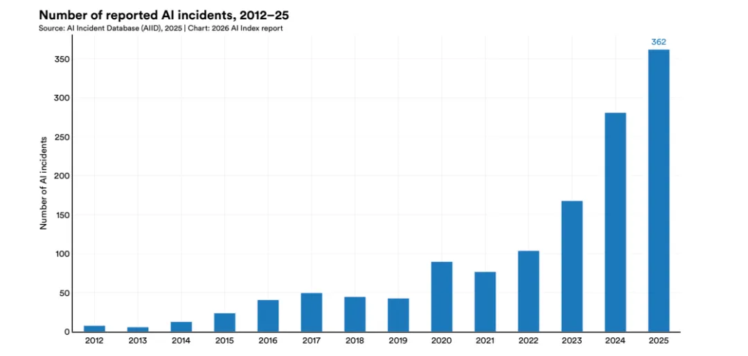 报告揭示了人工智能责任治理与技术发展之间日益扩大的鸿沟。2025年,被记录在案的人工智能安全事件数量从上一年的233起跃升至362起,涵盖深度伪造、隐私泄露、算法偏见等多个领域,增幅超过55%。主流大语言模型的幻觉率(Hallucination Rate)仍高达22%至94%,远未达到高风险场景所要求的可信赖标准。