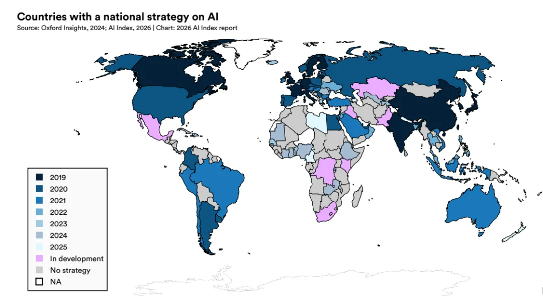 2025年,全球人工智能政策格局呈现三大趋势。第一,人工智能治理不再仅限于监管层面,“人工智能主权”(AI Sovereignty)正成为各国政策的核心关切,涵盖基础设施、数据、模型、应用和人才五大维度,但支撑主权目标所需的算力基础设施在全球分布极不均衡。第二,国家级人工智能战略加速扩展,增长最快的恰恰是此前缺乏正式人工智能政策的新兴经济体,非洲、中亚和中东地区的多个国家首次制定了人工智能发展战略。第三,各国在数据主权方面的路径选择出现明显分化——截至2024年,东亚和太平洋地区已出台77项数据本地化措施,而北美仅有3项,折射出不同地区在数据跨境流动问题上的根本分歧。