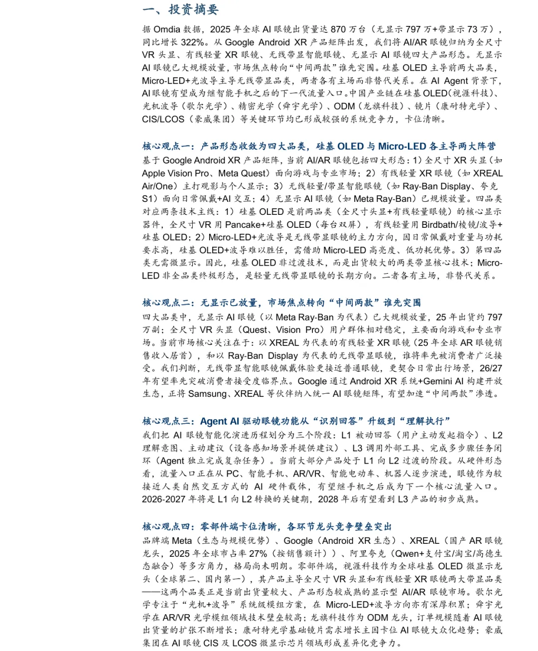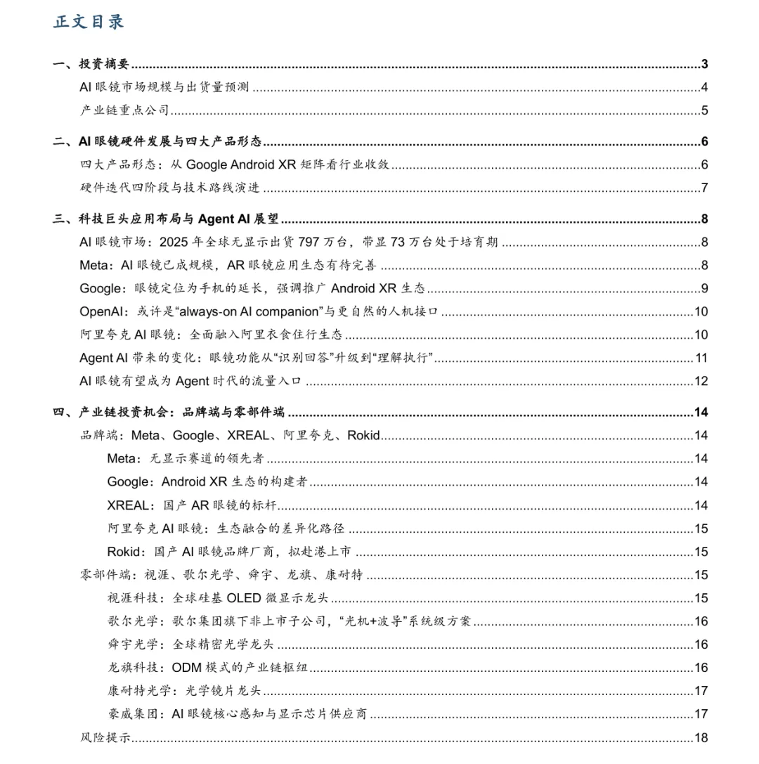 摘要:AI眼镜正成为智能体时代核心硬件入口,2025年全球出货870万台,同比增322%,分为无显示、有线XR、无线带显、全尺寸头显四大形态,无显示已放量,带显处培育期。技术沿硅基OLED、Micro-LED+光波导双主线演进。AgentAI推动眼镜从被动回答转向主动建议与任务执行,2026-2027年为关键升级期。中国供应链在微显示、光学、ODM、镜片等环节卡位清晰,视涯科技、歌尔光学、舜宇光学、龙旗科技、康耐特光学、豪威集团等具备全球竞争力,行业进入高速增长阶段。