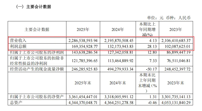 从2025年的核心业绩数据来看,恒顺醋业全年实现营业总收入22.87亿元,同比增长4.13%;归母净利润1.44亿元,同比增长12.80%;扣非净利润1.22亿元,同比增长7.33%,实现自2022年触底后连续第三年归母净利润正增长,营收规模也创下近五年历史新高。这份“双增”答卷,是公司连续多年优化经营、聚焦主业的成果,也印证了百年品牌的基本盘韧性。