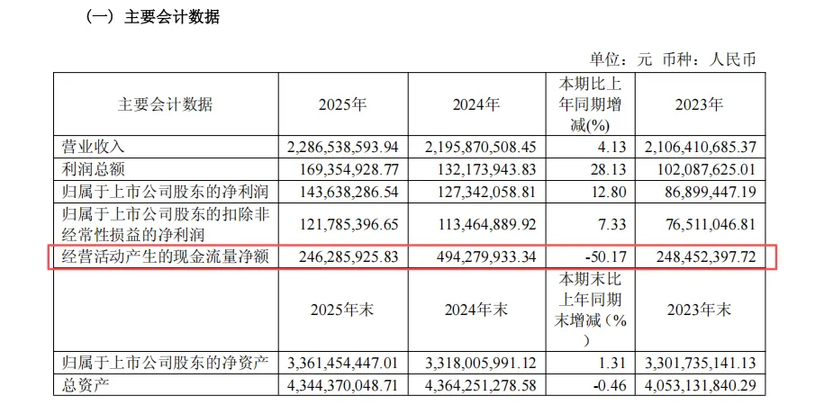 但与利润增长形成明显背离的,是公司经营现金流的大幅收缩。2025年,公司经营活动产生的现金流量净额为2.46亿元,同比下降50.17%,创下近十年来最大降幅,也是 2016年以来的次低值。从历年数据看,2020-2024年公司经营现金流始终稳定在3亿元以上,2025年的大幅下滑,直接反映出公司资金周转与回款能力承压。与此同时,公司盈利的现金保障能力显著弱化,2025年经营现金流净额仅为归母净利润的1.71倍,远低于2024年的3.86倍与2023年的2.48倍,利润的“含金量”有所下降。