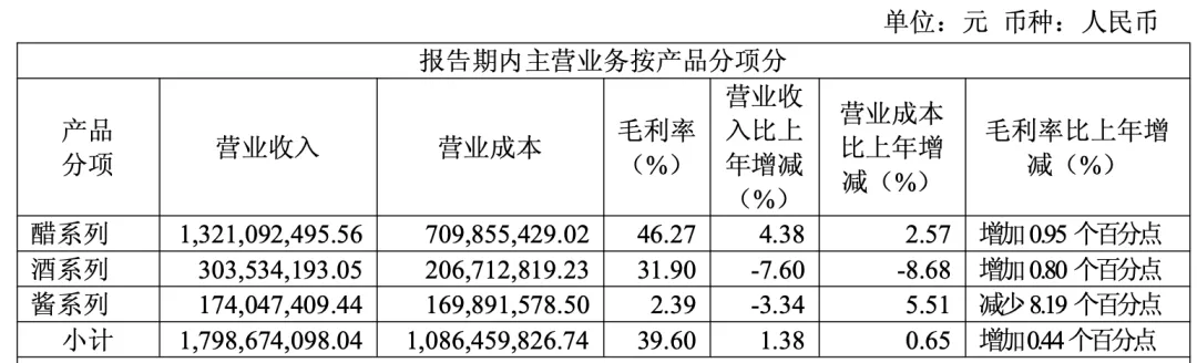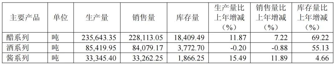 其他品类的表现更是雪上加霜。酒系列营收3.04亿元,同比减少7.60%,库存量达 3772.70 吨,同比增长55.13%,营收下滑与库存高增形成强烈反向走势。作为“醋、酒、酱”三大主业之一的酱类产品,更是陷入营收下滑与毛利率崩盘的双重困境:营收同比下降17.95%,毛利率同步减少3.16个百分点,内外销渠道同时出现毛利率下滑,直接拖累公司整体盈利水平。