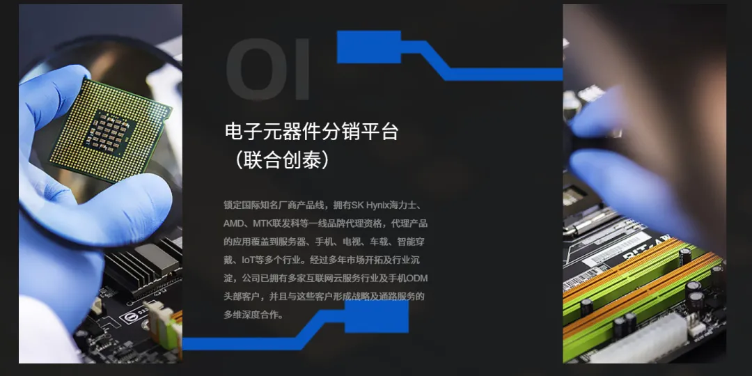 电子元器件分销平台(联合创泰):锁定国际知名厂商产品线,拥有SK Hynix海力士、AMD、MTK联发科等一线品牌代理资格,代理产品覆盖服务器、手机、电视、车载、智能穿戴、IoT等多个行业。