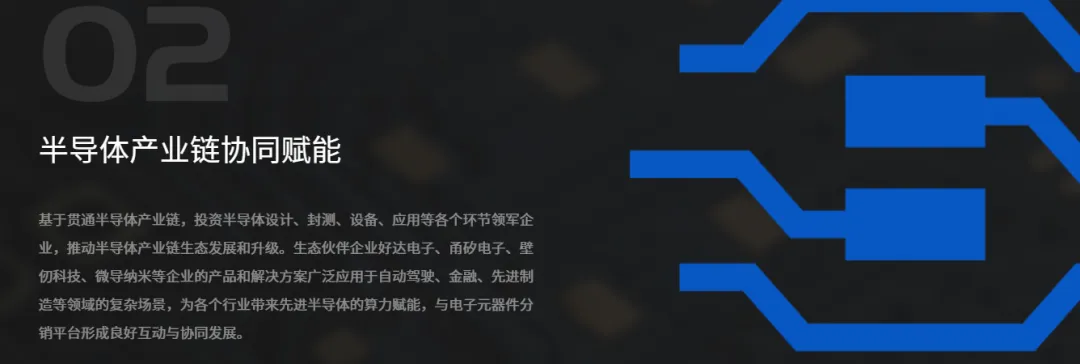 半导体产业链协同赋能:基于贯通半导体产业链,投资半导体设计、封测、设备、应用等各个环节领军企业,推动半导体产业链生态发展和升级。