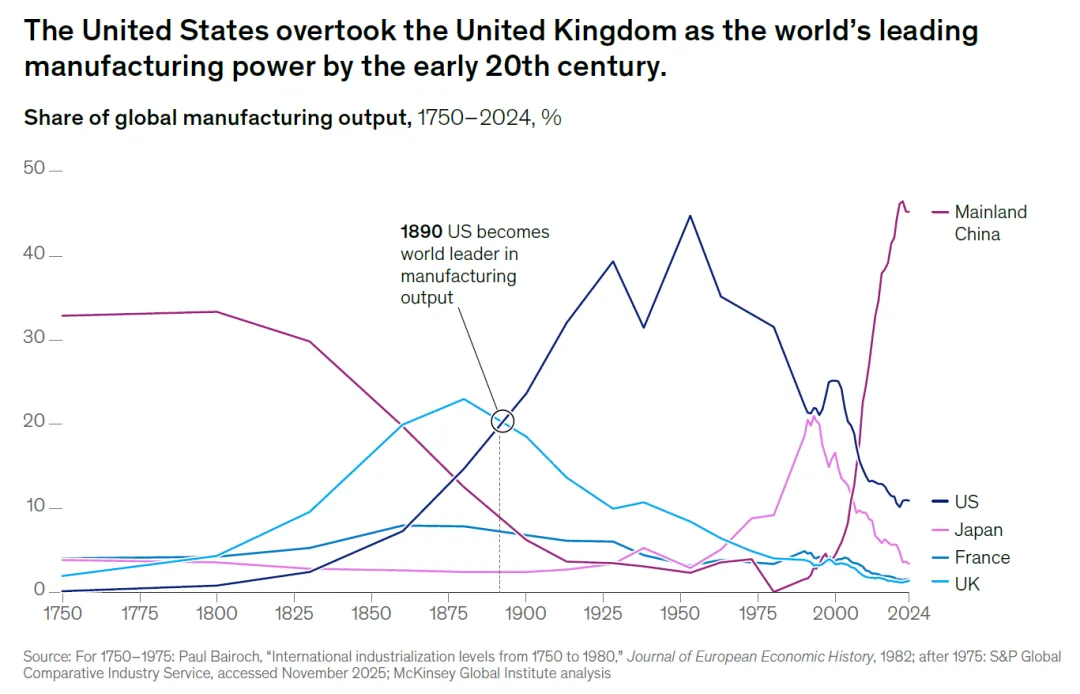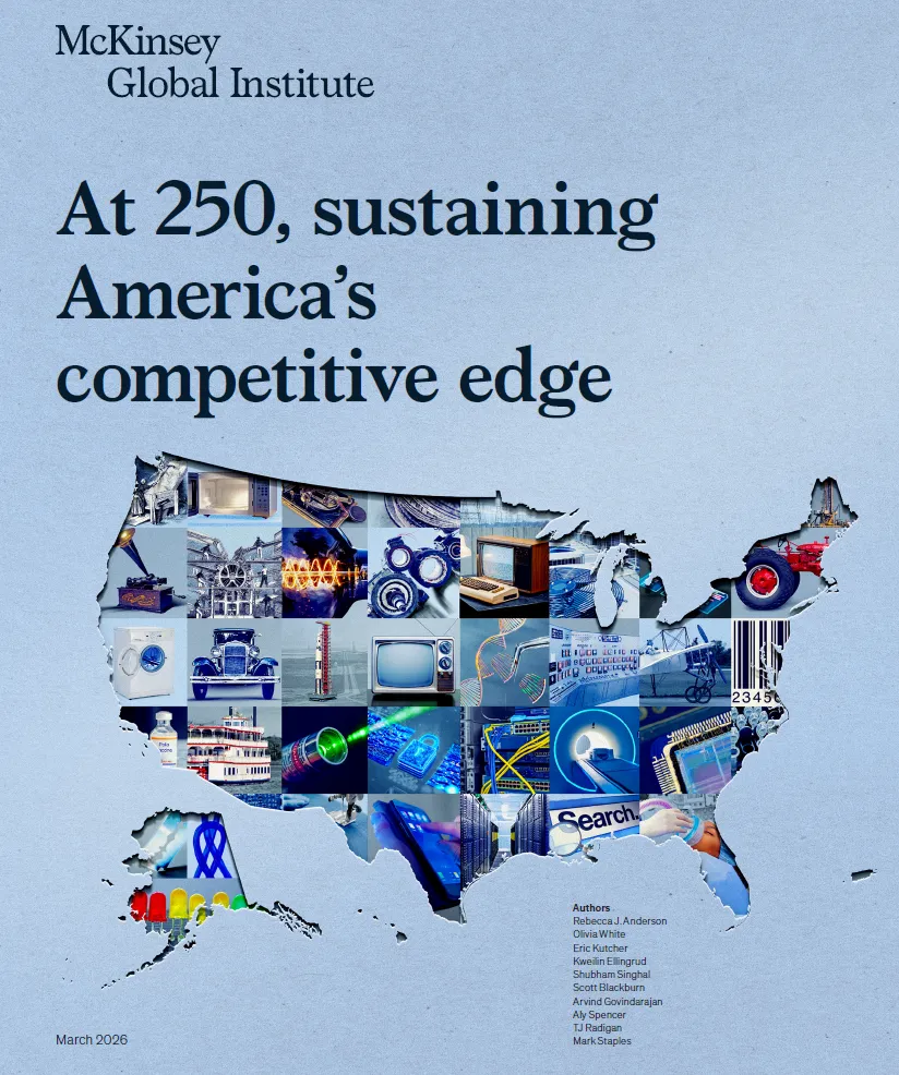 2026 年美国迎来建国 250 周年,麦肯锡最近发布了《建国 250 周年:美国经济竞争力研究报告》,系统复盘了美国从大西洋沿岸的农业殖民地,成长为全球规模最大、影响力最强经济体的 250 年发展历程,全面评估了其当前经济竞争力的核心优势、结构性短板与内外部挑战,并提出了巩固竞争力的核心行动议程。