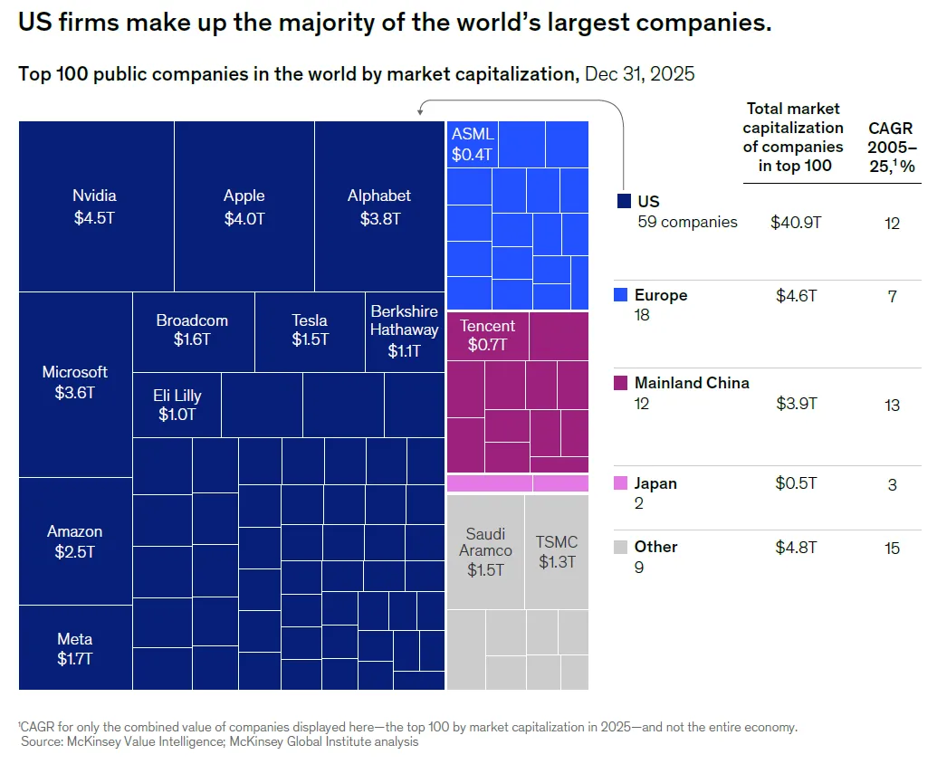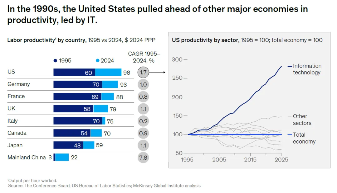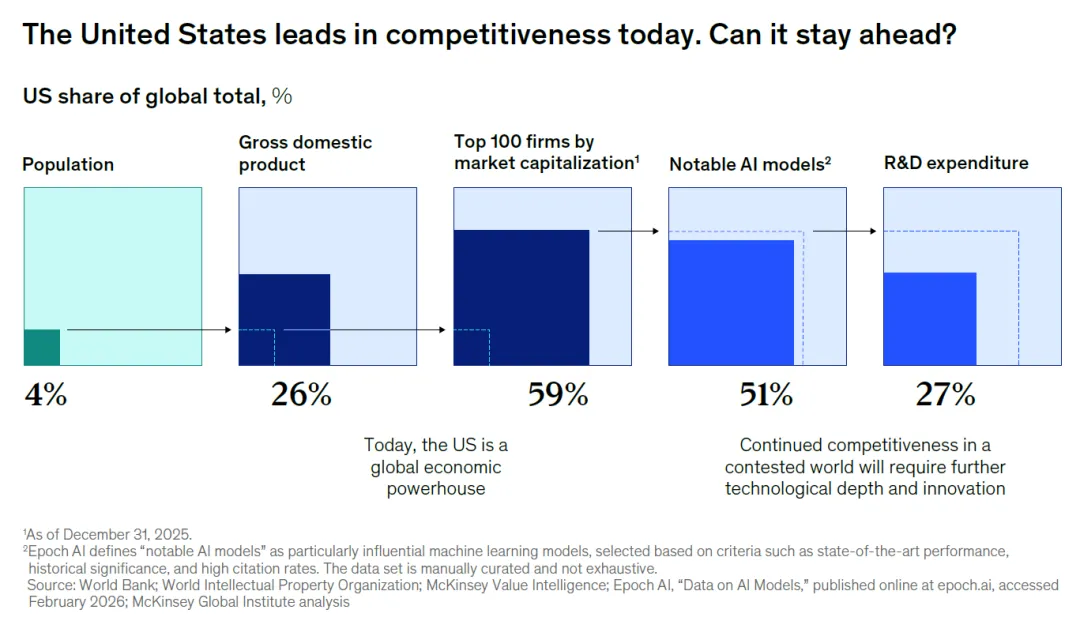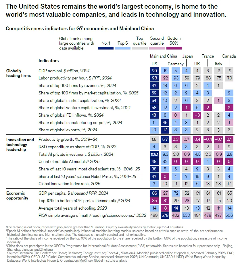 本文以麦肯锡这份核心研究为基础,结合世界知识产权组织(WIPO)全球创新指数、斯坦福大学《2025 年 AI 指数年度报告》、世界银行、美国劳工统计局、世界不平等数据库等权威机构数据,对美国经济竞争力的演进逻辑、现状格局与未来走向进行全面、深度的解读与延展分析,完整还原美国经济竞争力的全貌与核心矛盾。
