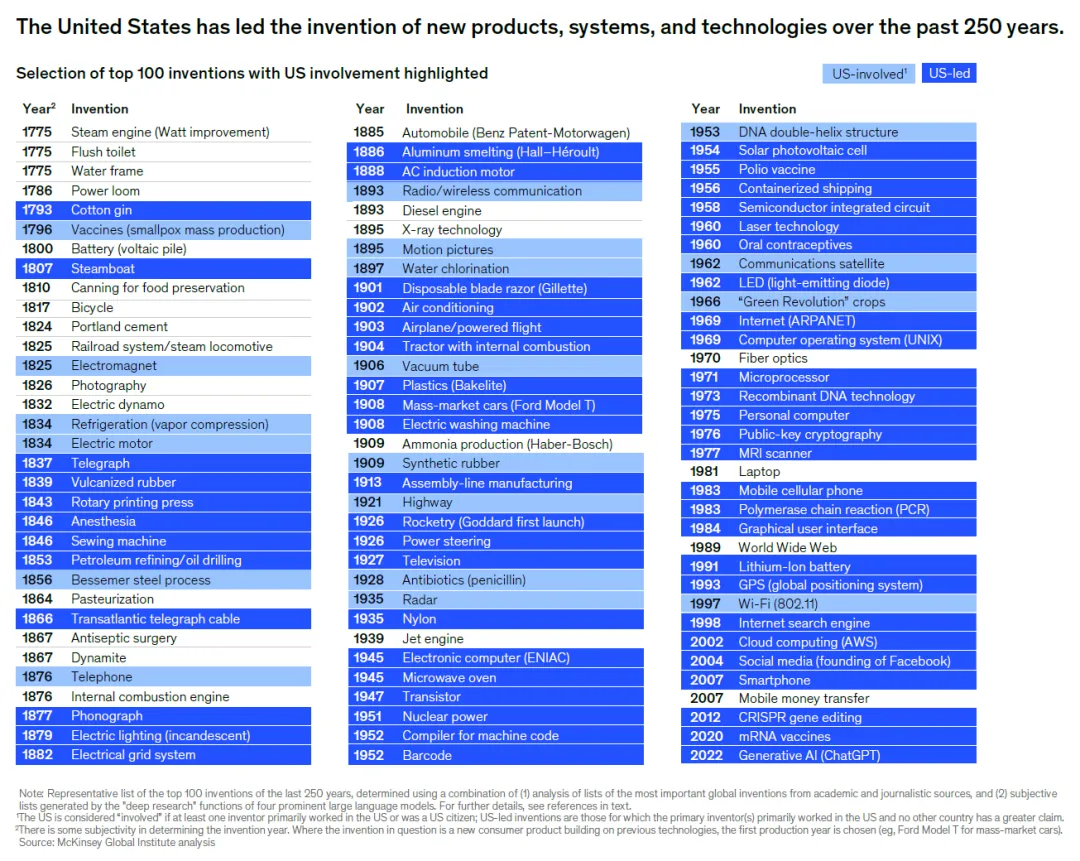 科技创新是美国经济竞争力的核心护城河,也是其 250 年来持续实现增长跃迁的核心动力。过去 250 年里,全球 100 项最具影响力的创新成果中,76 项至少部分诞生于美国,由美国科研人员与产业界完成研发与落地。