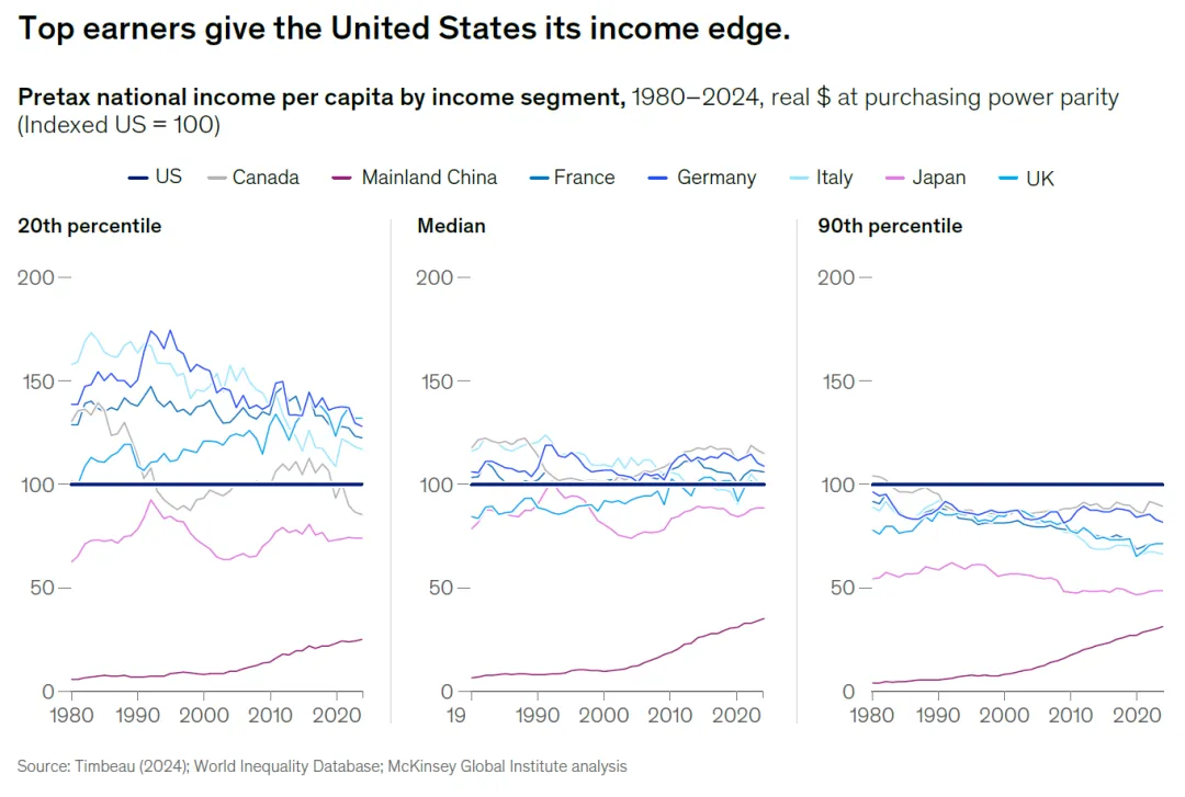 收入结构的顶层优势尤为突出:美国收入前 10% 群体的薪资水平,较欧洲主要经济体与加拿大的同层级群体高出 10%-50%;收入前 40% 的群体,收入水平高于欧洲主要经济体的同层级群体;收入前 20% 的群体,收入水平超过加拿大同层级群体。高收入群体的规模优势,推动美国形成了全球规模最大、层次最丰富的消费市场,而消费市场的繁荣又反向推动企业创新与生产率提升,形成了 “收入增长 - 消费扩张 - 产业升级” 的正向循环。