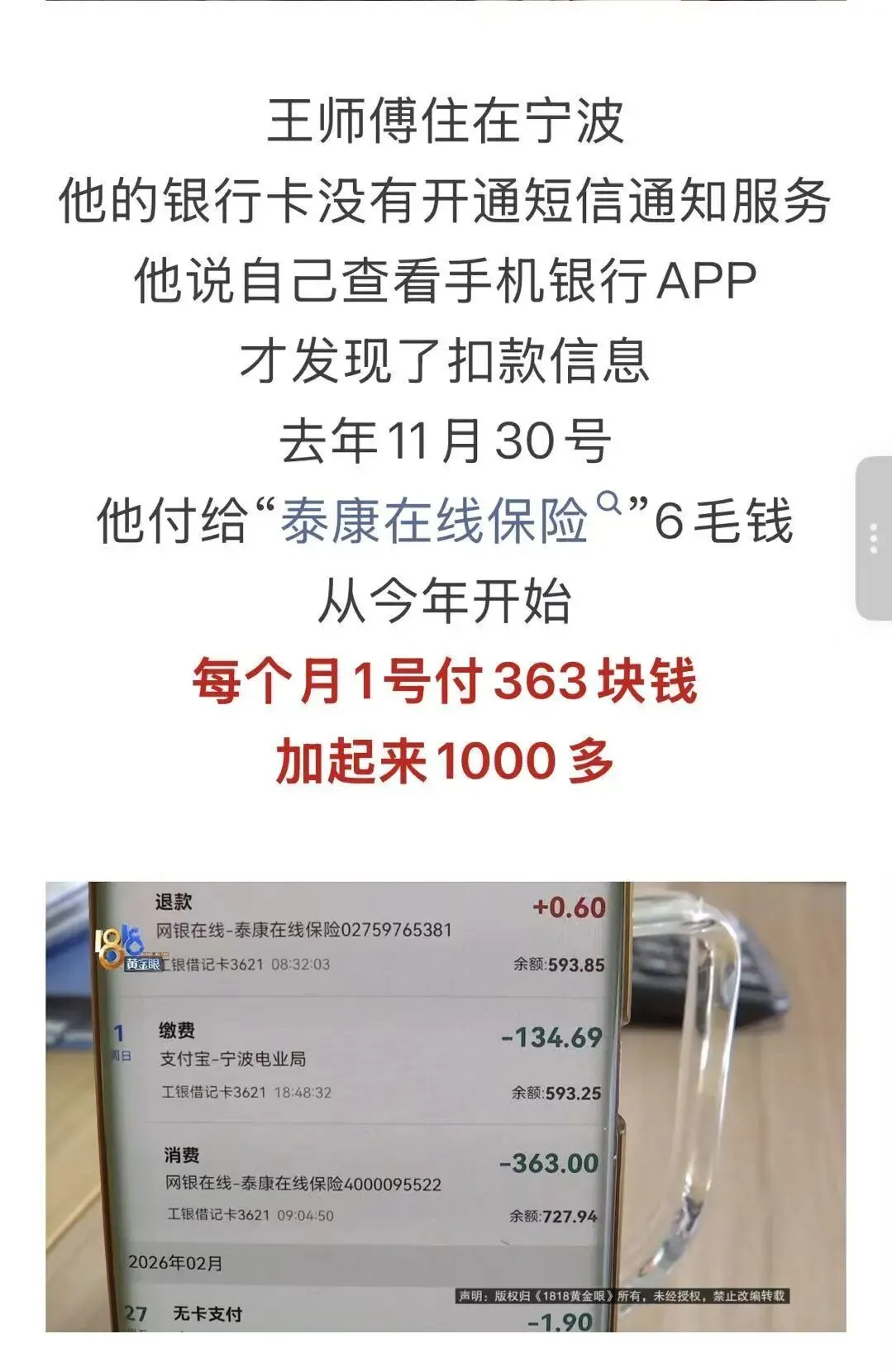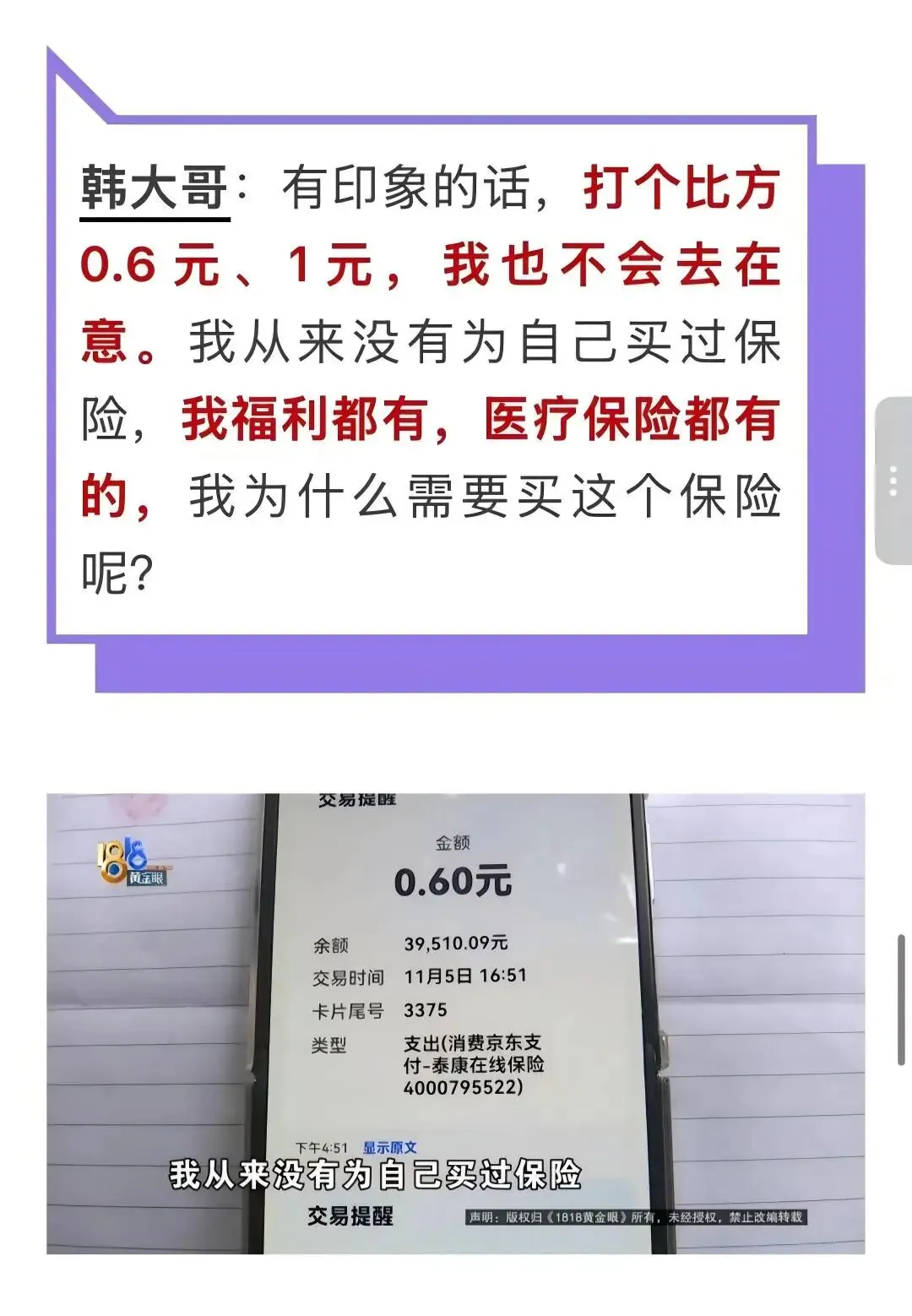 据浙江广播电视集团旗下1818黄金眼公众号2026年3月13日报道:家住宁波的王师傅在自己完全不知情的情况下银行卡被泰康在线保险扣款近1000多元,他查看自己手机银行时才发现,最初的一笔扣款就是从0.6元开始的。泰康在线正是利用这种超低的价格作为诱饵,让用户因金额过小而放松警惕,击穿用户防范心理。2026年1月5日的一则报道显示:韩大哥于一日早上突然收到一条扣款600多元的短信,后经多方帮助核实,扣款是支付泰康在线的保费,而韩大哥对此却一无所知。泰康客服的回复是韩大哥浏览了广告平台的推广信息,并进行了银行快捷支付签约,之后成功购买了一款重疾险。韩大哥则表示,这种0.6元、1元的支付,他都没在意。与上一案例类似,泰康在线同样是利用了消费者的疏忽进行了保险销售及签约行为。两则报道中均显示,泰康在线愿意给予投诉的客户慰问金甚至赔偿,在表面上造成知错即改的假象,实则是息事宁人,更是为了在监管面前掩人耳目,而背后大量毫不知情的扣费仍在进行。更为离谱的是,泰康集团还玩起了“贼喊捉贼”的游戏。放大镜查看泰康养老陕西分公司微信公众号2026年3月11日的一则消息:提示消费者警惕低价引流陷阱,而让消费者警示的正是0.6元的低价引流案例。(二)粗放营销的本质:流量至上,合规缺位