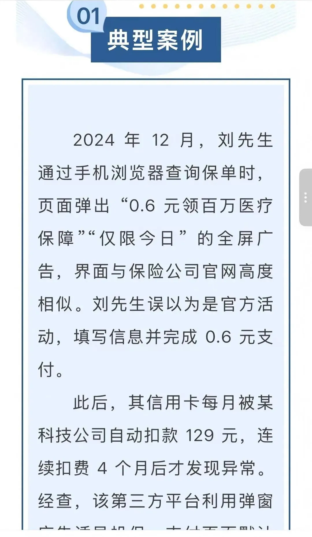 泰康在线的“狂飙业绩”与“合规困局”,是整个互联网保险行业粗放营销的缩影。在流量红利见顶、监管持续收紧的背景下,互联网保险平台必须摒弃“唯规模、唯利润”的短视思维,回归“保险姓保”的本源,走合规化、精细化、服务化的转型之路。对行业而言:必须摒弃流量绑架,强化全流程销售管控,取消默认勾选,杜绝强制搭售,真正保障消费者知情权与选择权。对消费者而言:要警惕“首月1元”“低价高保额”等陷阱,仔细阅读条款,及时关闭自动续费,遭遇违规扣费积极向监管与投诉平台维权。延伸提醒:如果遭遇违规扣费、理赔拒赔等问题,可通过国家金融监督管理总局、黑猫投诉平台维权,保留好扣费流水、投保记录等证据。