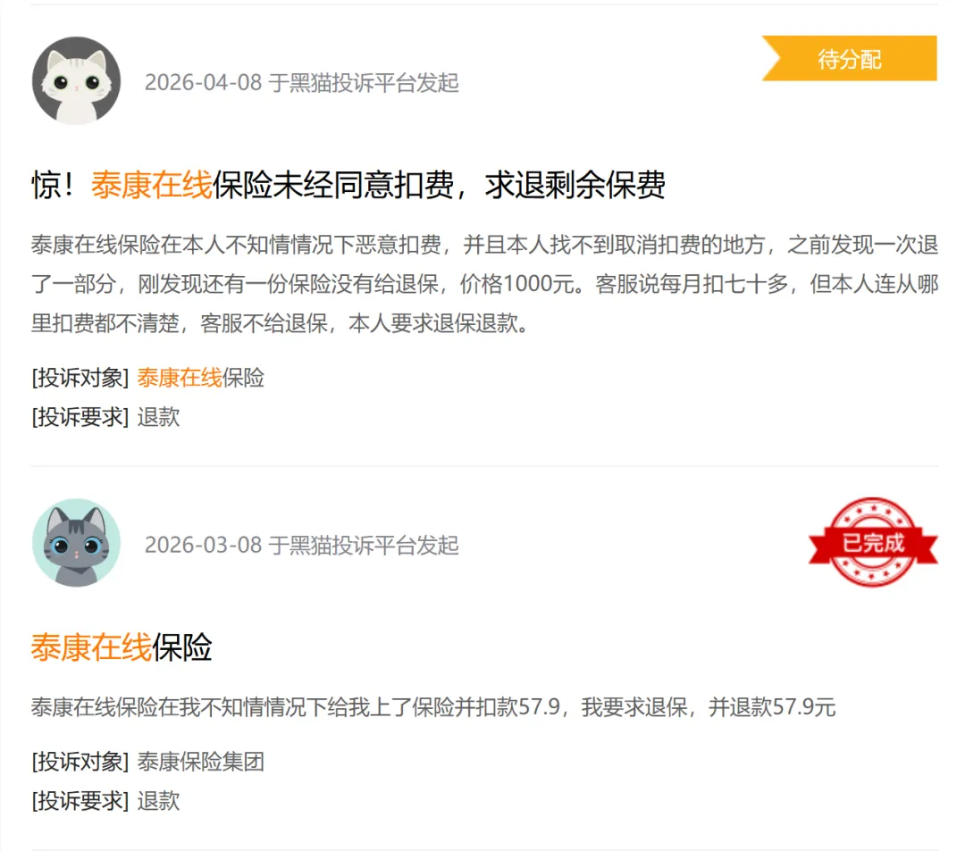 泰康在线的“隐形保单”模式,本质是依托第三方渠道的流量红利,通过设计精巧的页面交互、利用消费者疏忽大意,实现批量获客。这种粗放式营销完全背离了互联网保险“便捷、透明”的核心定位,将“转化效率”置于用户权益之上。值得注意的是,这类问题并非偶然。早在多年前,原银保监会就曾针对泰康在线短期健康险销售误导、违规搭售问题下发整改命令,但2024—2025年复查中,部分违规仍未根治,反而在第三方平台场景中进一步扩散,凸显出营销端合规管理的严重缺位。三、投诉爆发:黑猫投诉平台的集中爆发