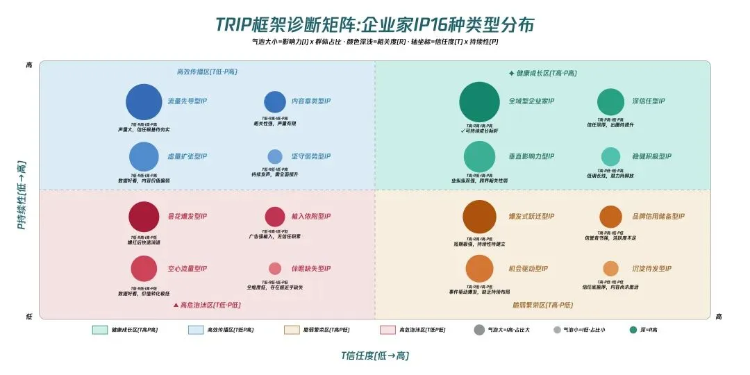 为解决IP价值“看不见、摸不着、算不清”的行业痛点,白皮书首次系统性地提出了TRIP企业家视听IP价值评估体系,从信任度(Trust)、相关度(Relevance)、影响力(Impact)与可持续性(Persistence)四个维度,对企业家IP进行全生命周期的健康诊断,以此替代“唯粉丝数论”的传统评估方式。