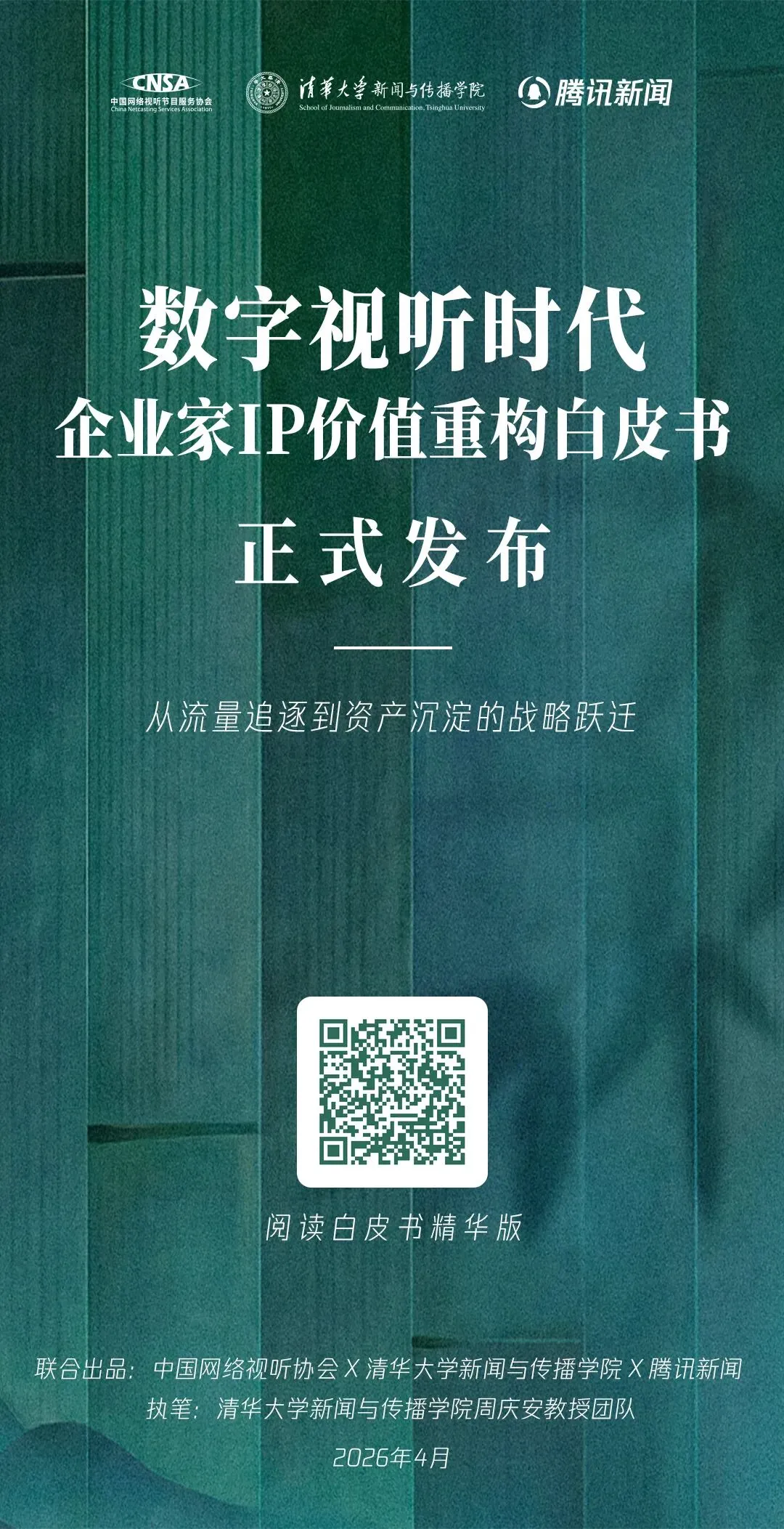 2026年4月14日至16日,第十三届中国网络视听大会在成都举办。期间,中国网络视听协会、清华大学新闻与传播学院、腾讯新闻联合举办“腾讯新闻视听时代企业家IP塑造论坛”,并在论坛上共同发布了中国首份企业家IP研究白皮书——《数字视听时代企业家IP价值重构白皮书》(以下简称“白皮书”)。