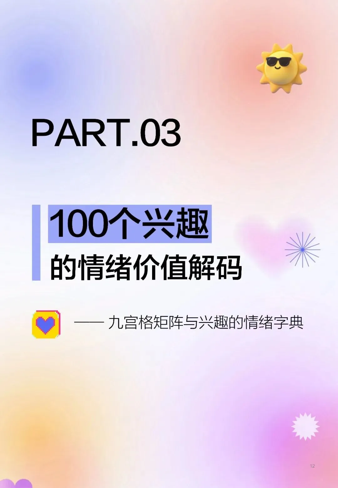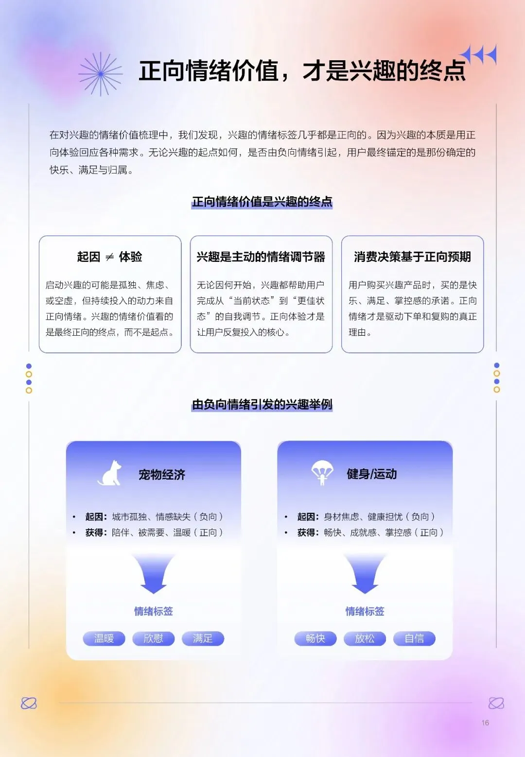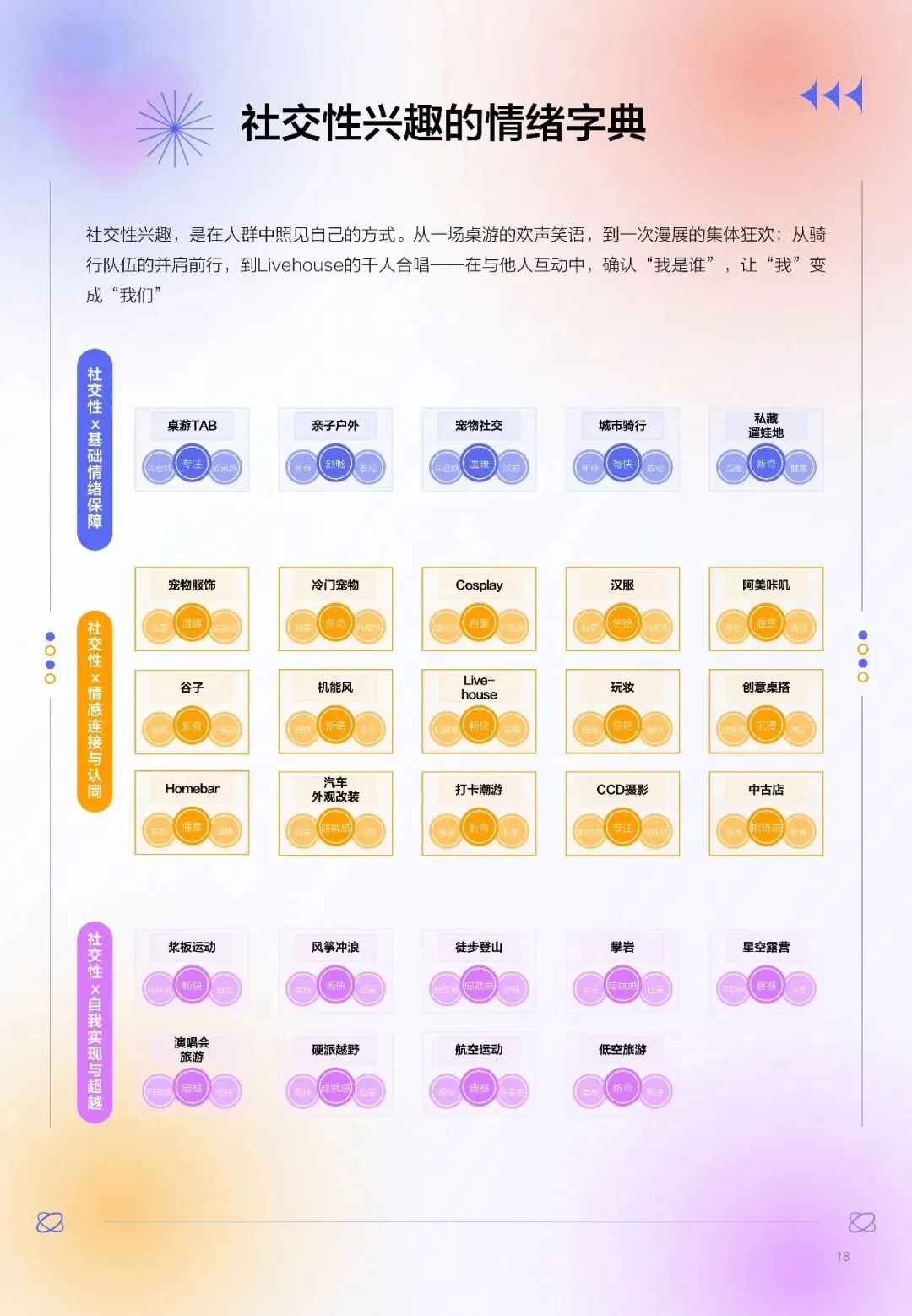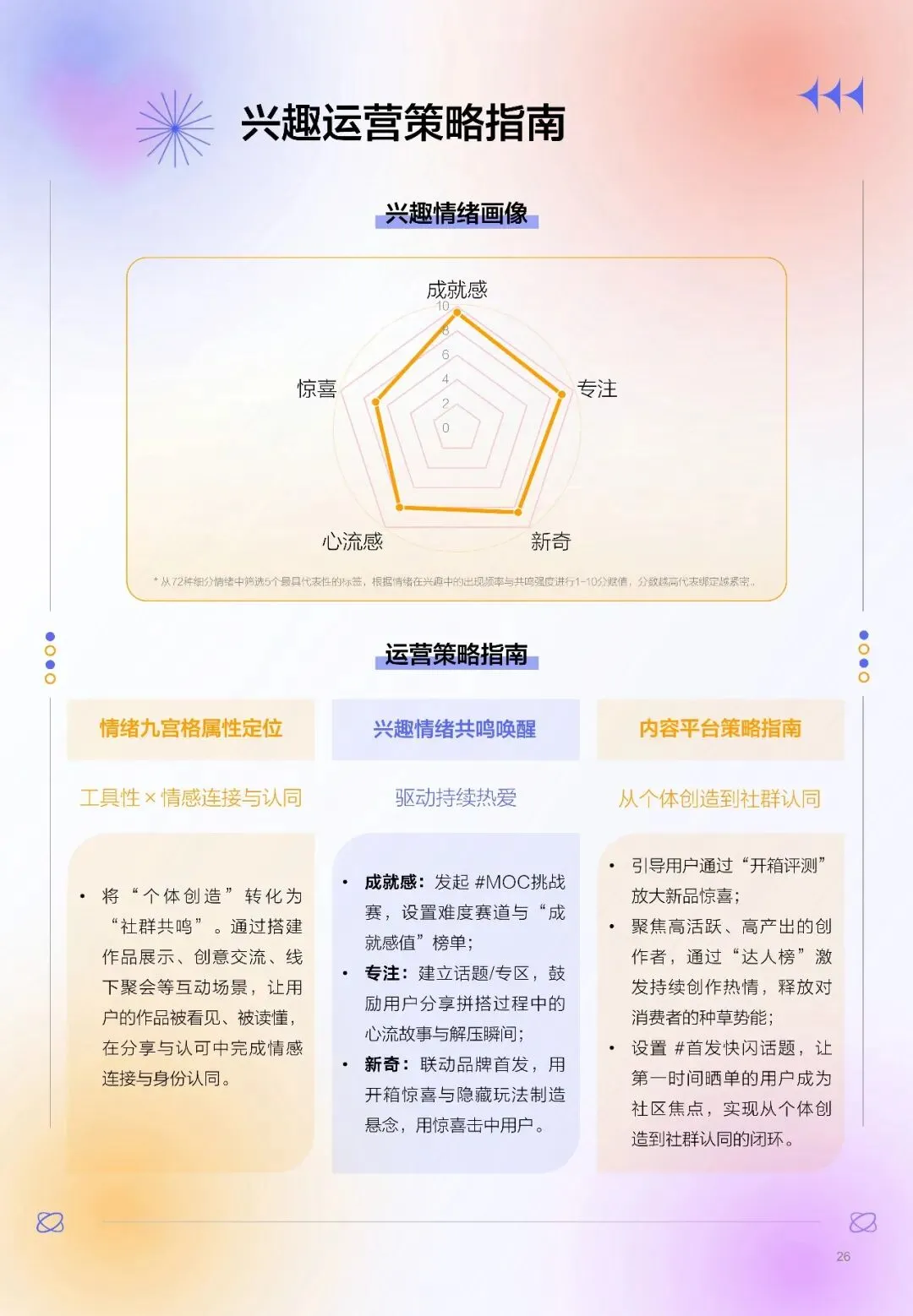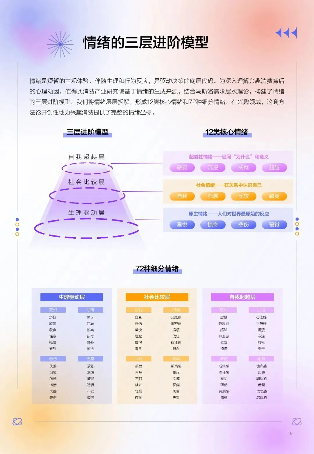 在物质丰裕时代,兴趣已成为当代人构建自我、表达身份的核心方式。兴趣消费不仅满足功能需求,更触动人心的复杂情绪,如成就感、归属感等。报告构建了情绪三层进阶模型,涵盖72种细分情绪,为兴趣消费提供情绪坐标。通过分析100个兴趣标签,揭示兴趣背后的情绪价值,如宠物营养餐带来温暖与满足,积木潮玩激发成就感与新奇感。