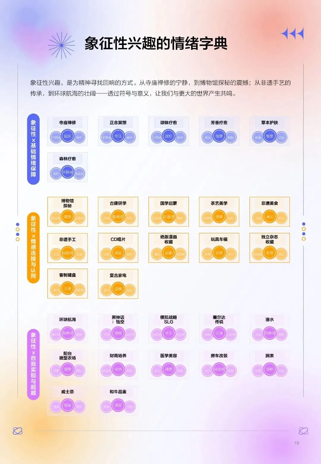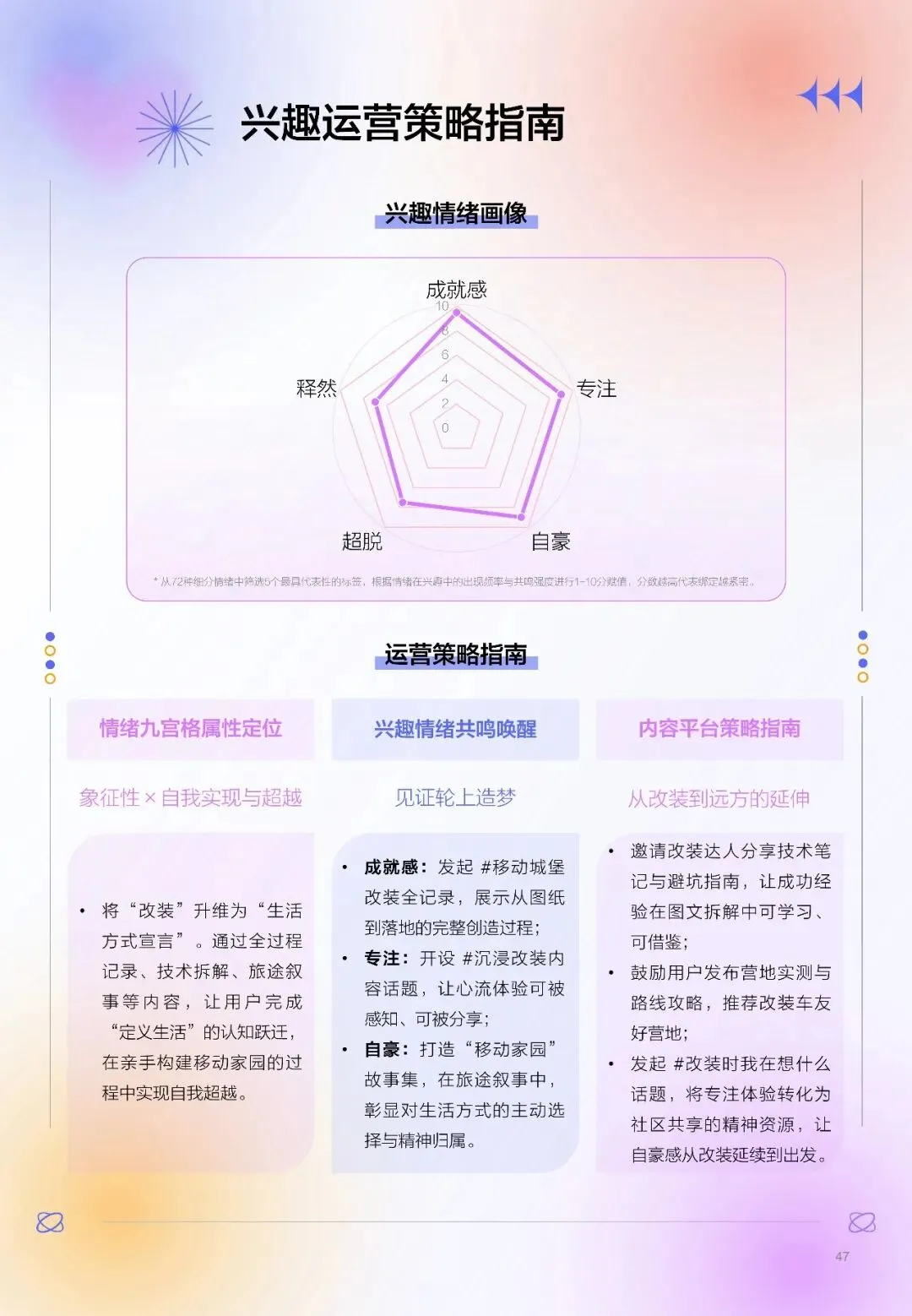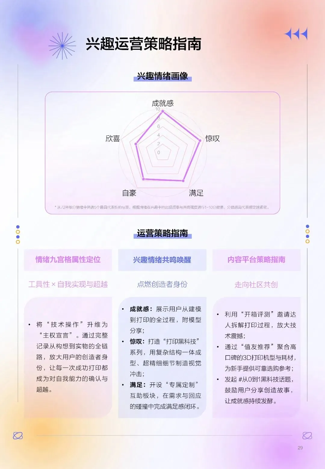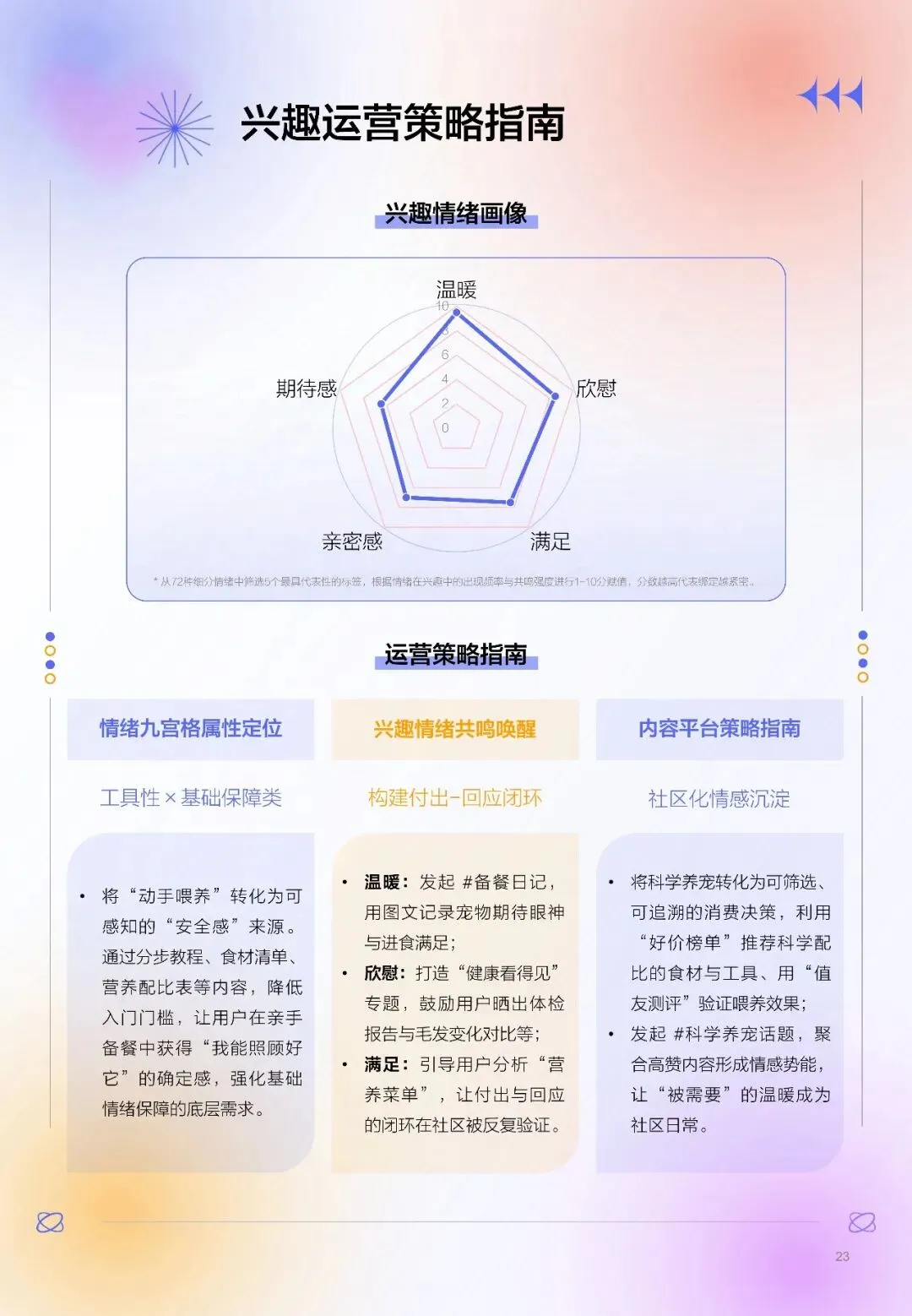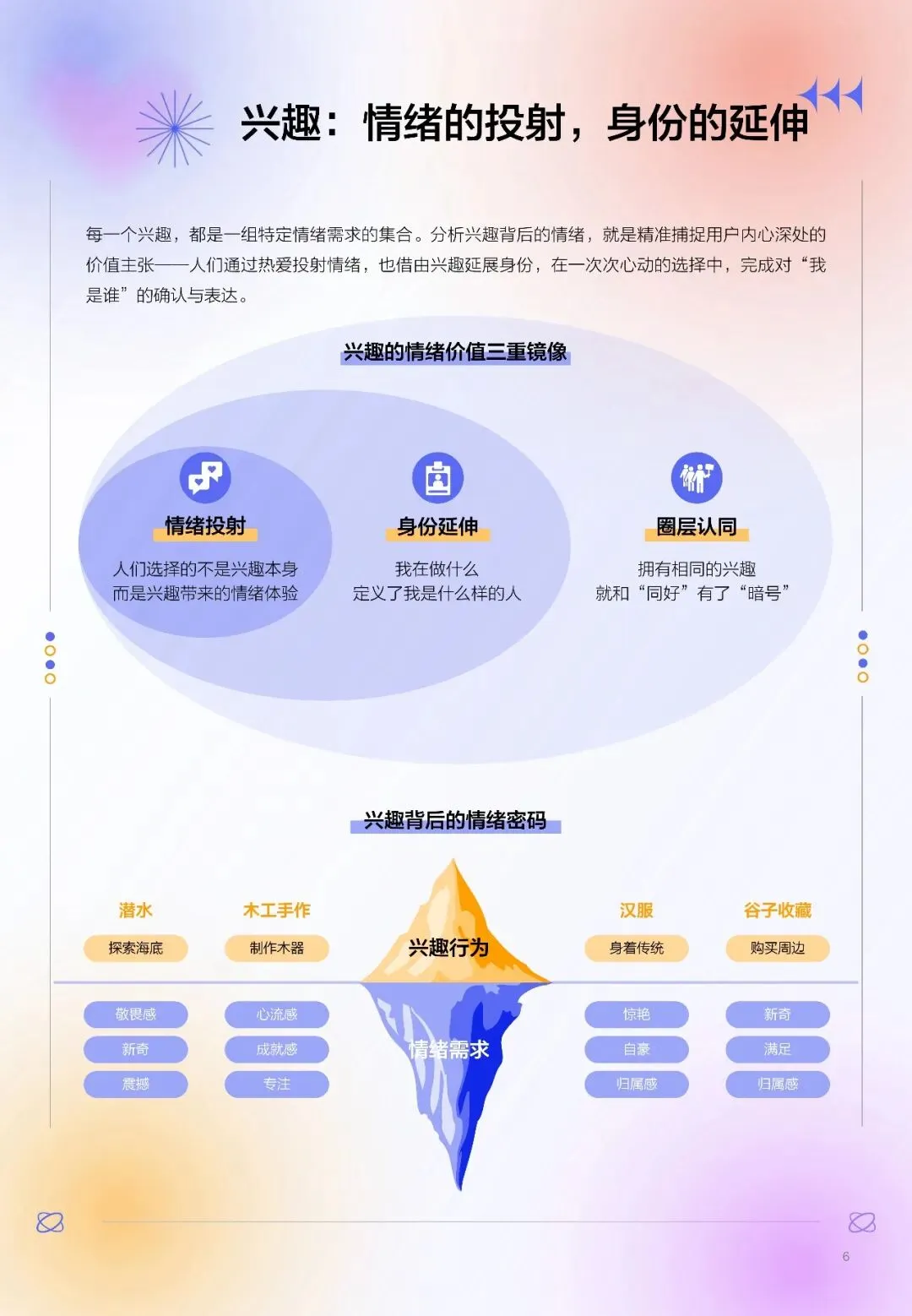 在物质丰裕时代,兴趣已成为当代人构建自我、表达身份的核心方式。兴趣消费不仅满足功能需求,更触动人心的复杂情绪,如成就感、归属感等。报告构建了情绪三层进阶模型,涵盖72种细分情绪,为兴趣消费提供情绪坐标。通过分析100个兴趣标签,揭示兴趣背后的情绪价值,如宠物营养餐带来温暖与满足,积木潮玩激发成就感与新奇感。