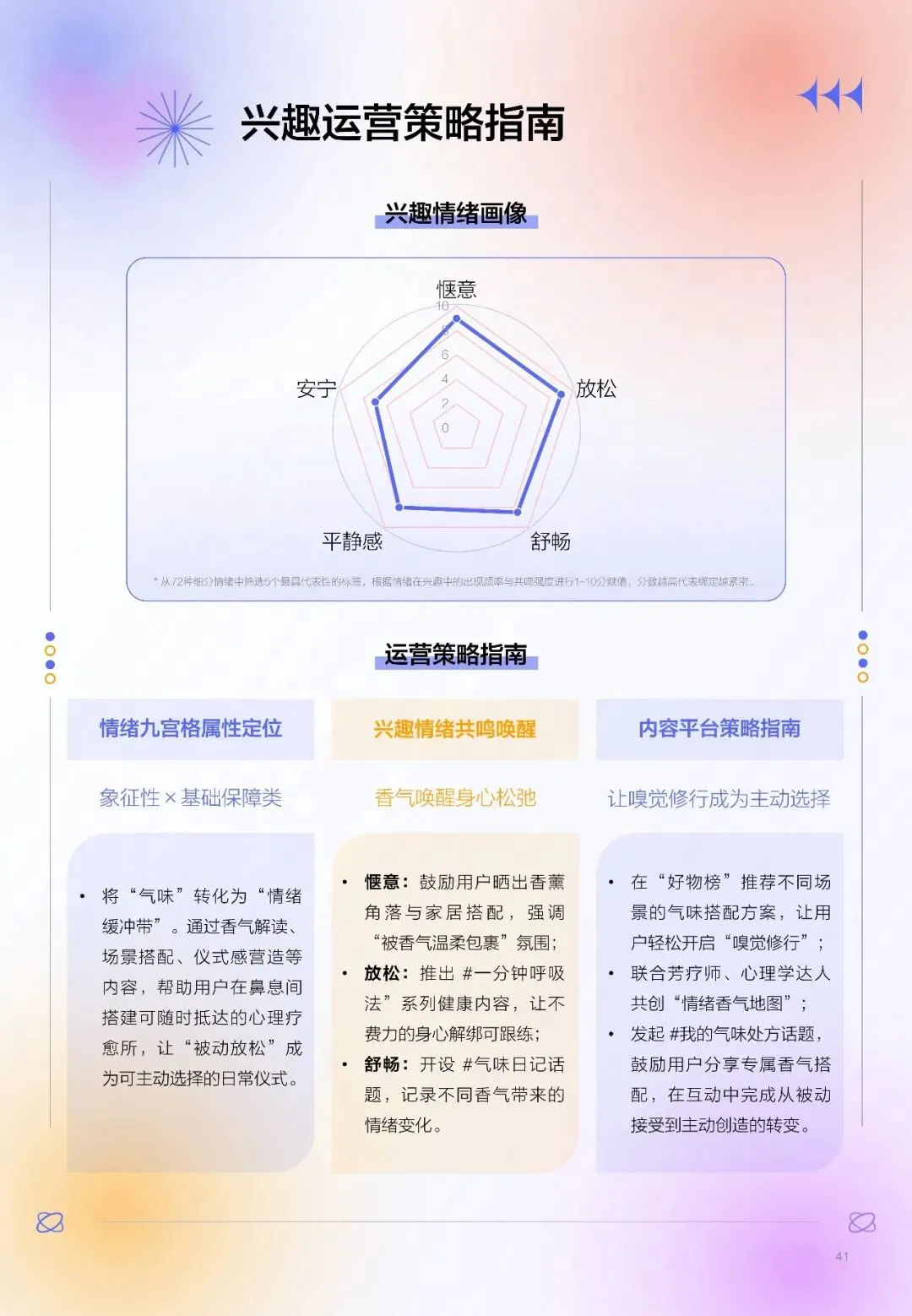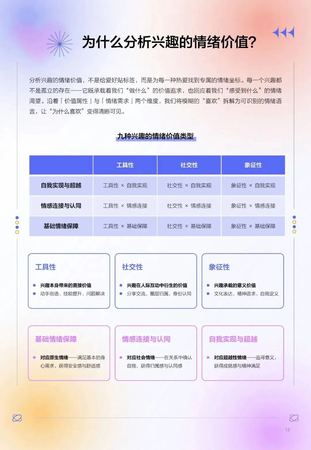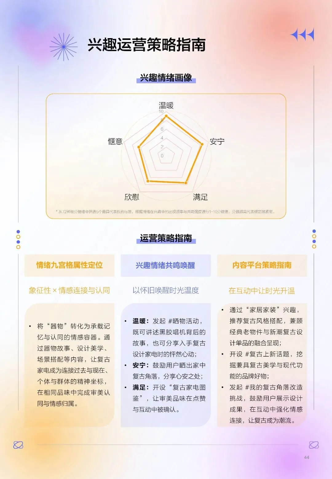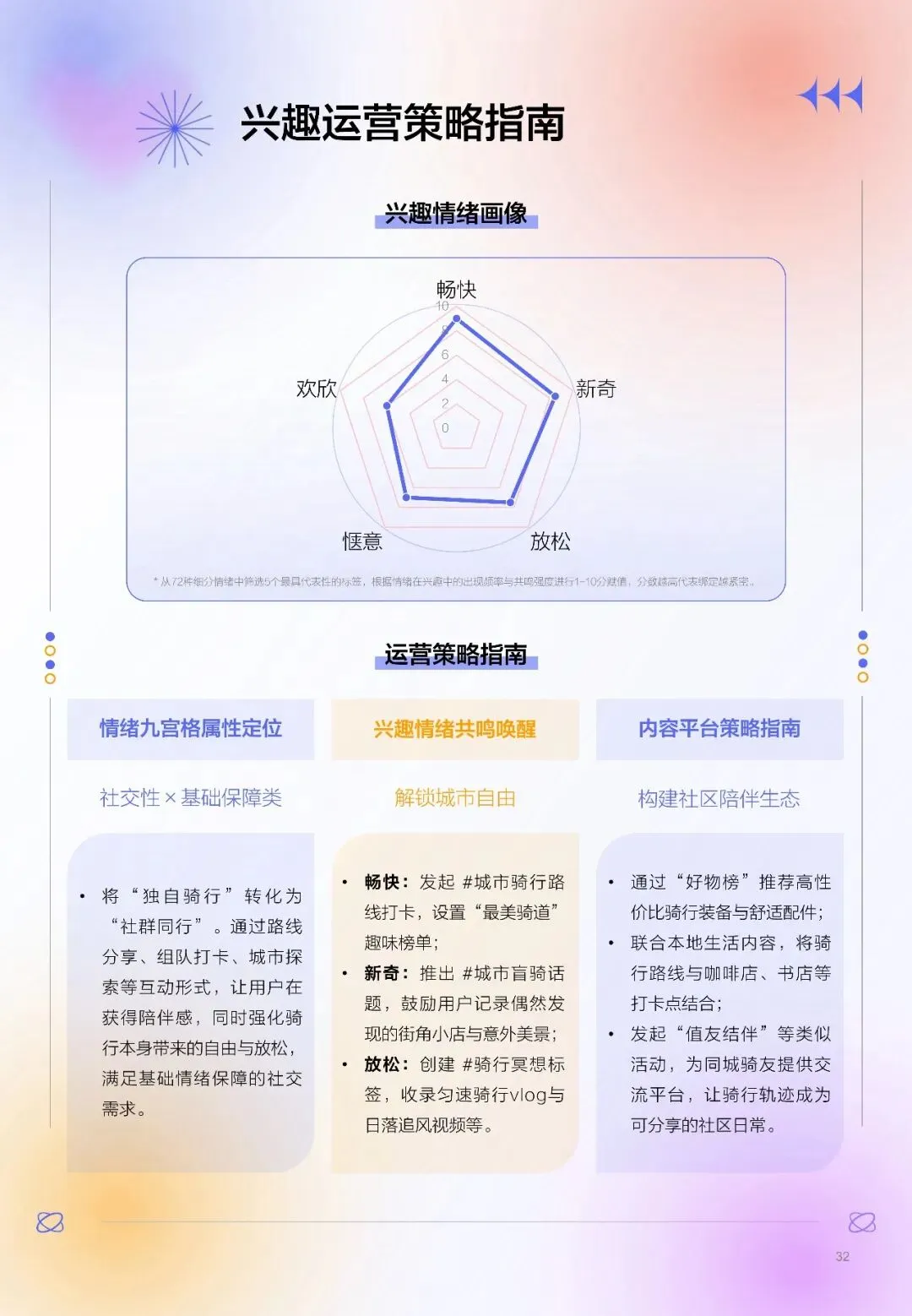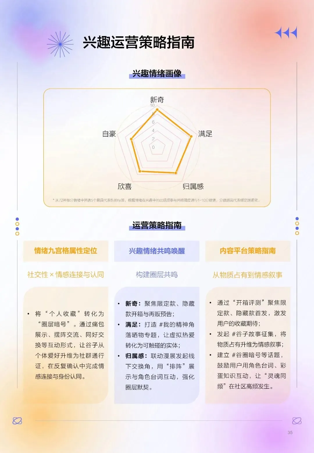 在物质丰裕时代,兴趣已成为当代人构建自我、表达身份的核心方式。兴趣消费不仅满足功能需求,更触动人心的复杂情绪,如成就感、归属感等。报告构建了情绪三层进阶模型,涵盖72种细分情绪,为兴趣消费提供情绪坐标。通过分析100个兴趣标签,揭示兴趣背后的情绪价值,如宠物营养餐带来温暖与满足,积木潮玩激发成就感与新奇感。
