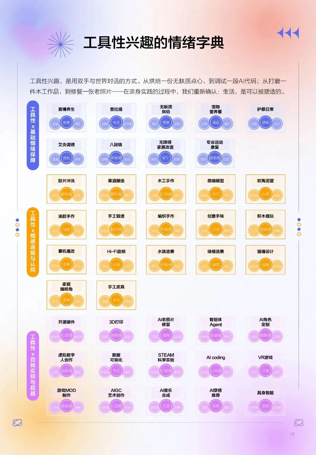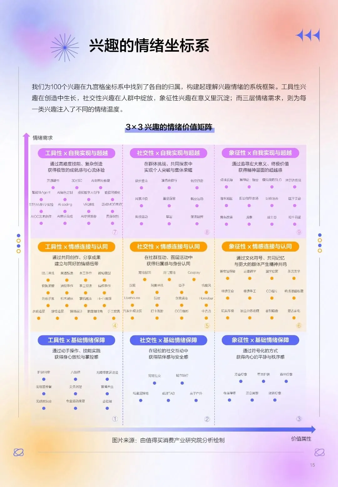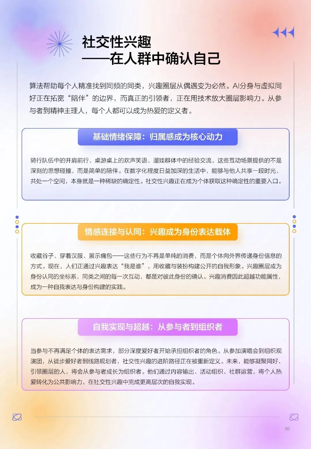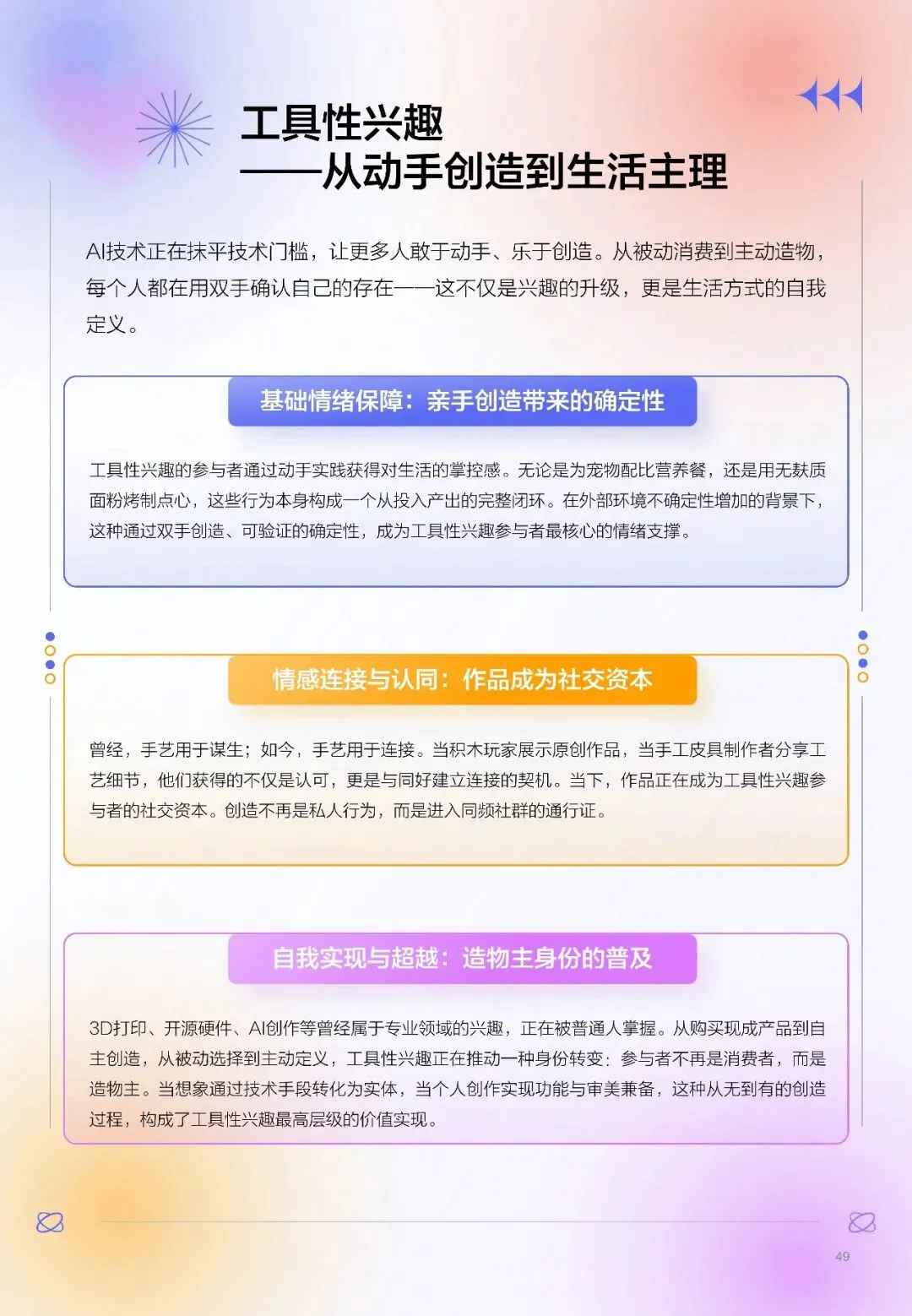 报告还指出,工具性兴趣让人通过动手创造获得掌控感,社交性兴趣在人群中确认自我,象征性兴趣则为精神寻找回响。未来,随着AI技术普及,工具性兴趣将推动造物主身份普及,社交性兴趣将拓宽陪伴边界,象征性兴趣则赋予古老热爱新生命力。整体看,兴趣消费正成为热爱的延续,情绪成为链接兴趣与消费的关键。