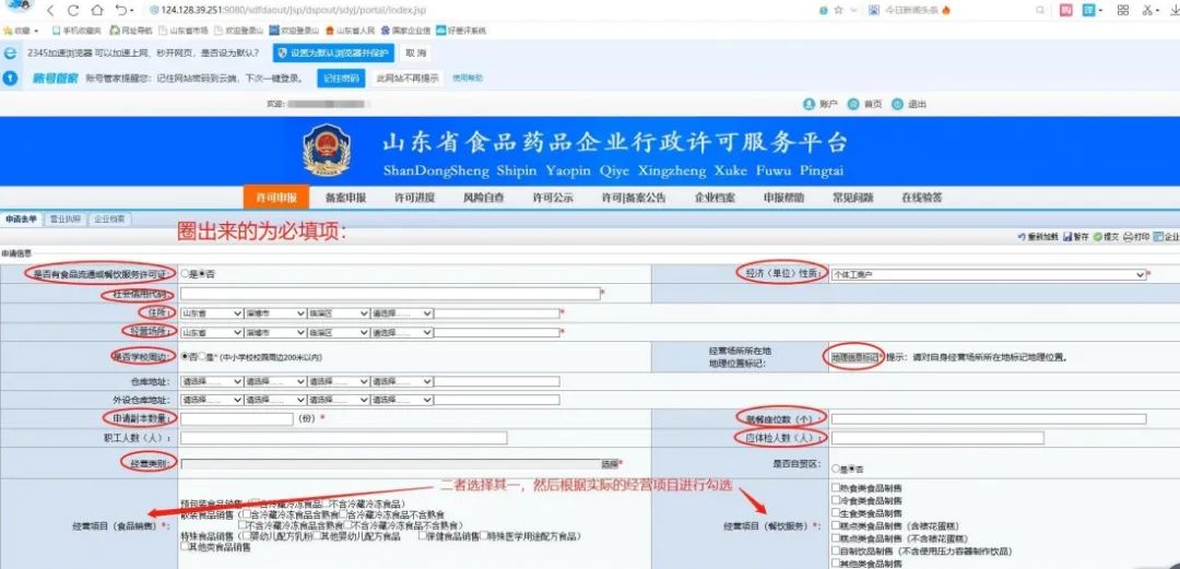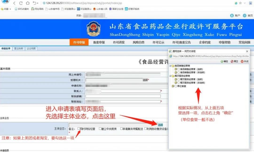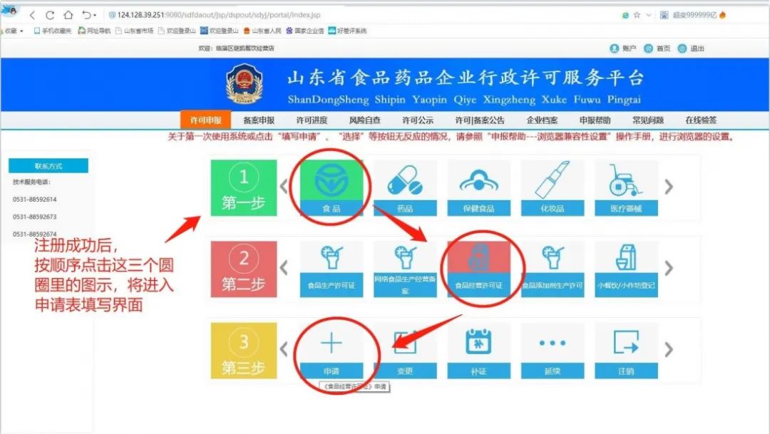 1.注册成功后,食品经营业户第一步选择食品,第二步选择食品经营许可证,第三步选择申请(变更、延续、补证、注销的不选),填写申请表,如下图: