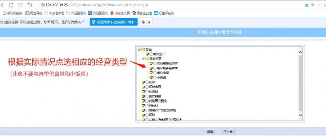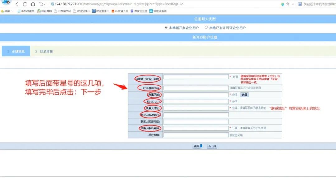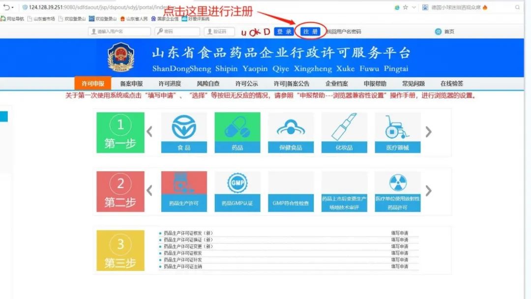1.登录山东省食品药品企业行政许可服务平台(网址http://124.128.39.251:9080/sdfdaout/)点击:注册,如下图:
