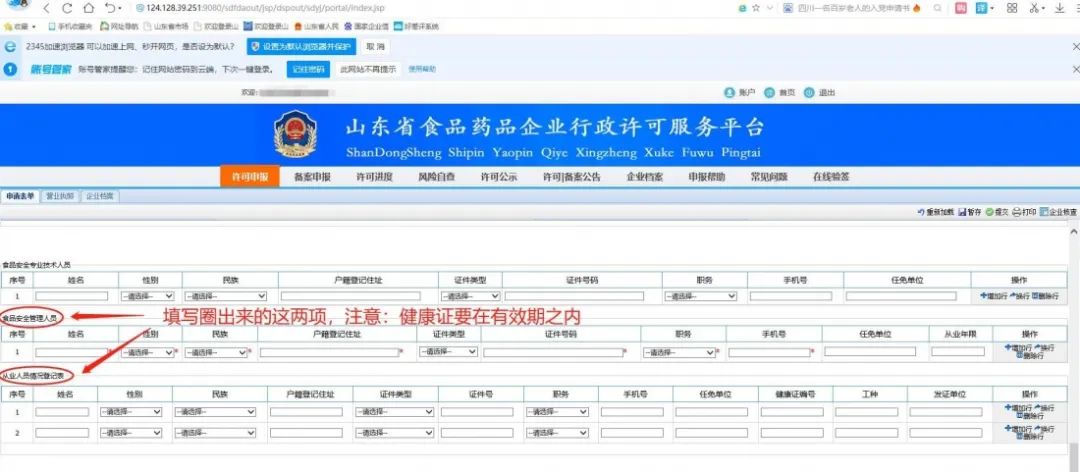 5.继续填写食品从业人员信息,如下图:注意健康证要在有效期之内,过期的要重新办理,食品安全专业技术人员如有可填写,食品安全管理人员必填,从业人员登记表必填;从业人员登记表人数必须要和上面职工人数、应体检人数数量一致。