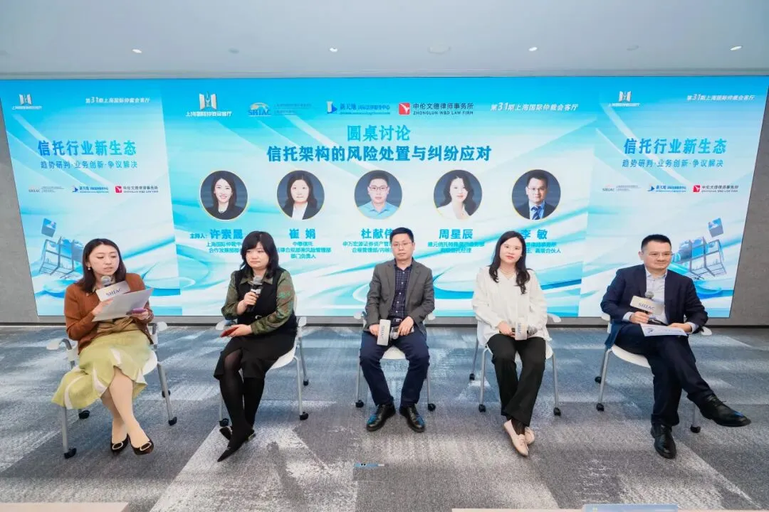 第二场圆桌讨论以“信托架构的风险处置与纠纷应对”为主题,由上海国际仲裁中心合作发展部部长许索晟主持。中泰信托法律合规部兼风险管理部部门负责人崔娟结合实际案例指出,信托财产独立性与商事外观主义存在冲突,充分披露及保障债权人的知情权是关键;申万宏源证券资产管理有限公司合规管理部/内核部经理杜献伟从管理人勤勉义务出发,强调投资决策重过程而非结果,适当性需实质匹配,损失与违规须有因果关系;建元信托特殊资产业务部高级信托经理周星辰以破产重整为例,展示服务信托在低效资产处置等场景的架构设计和重要作用;中伦文德律师事务所执委会主任、高级合伙人李敏结合自身多年信托项目的丰富实务经验,通过相关典型案例指出信托架构设计、决策机制安排及风险项目处置节奏对纠纷解决路径与效率具有关键影响。