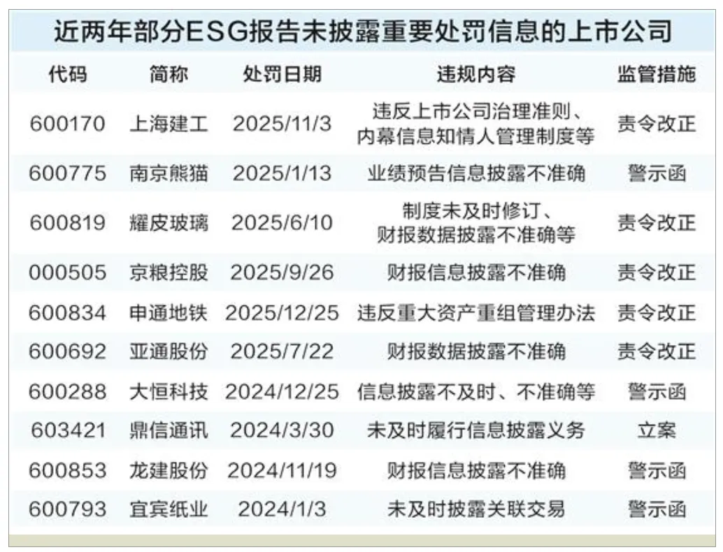 2026年,A股市场迎来ESG强制披露“首考”。根据2024年4月沪深北交易所发布的《上市公司可持续发展报告指引》,约470家核心指数样本公司及“A+H”两地上市公司,需在2026年4月30日前披露首份可持续发展(ESG)报告。近年来,监管部门持续出台ESG披露配套准则与编制指南,不断细化披露规范,鼓励引入第三方鉴证提升报告公信力,推动上市公司ESG披露向规范化、制度化稳步迈进。政策驱动下,A股ESG披露率持续攀升,2024年达47%。截至2026年4月15日,已有近1000家公司完成2025年ESG报告披露,强制披露“首考”有序推进。但与此同时,ESG报告定量数据缺失、选择性披露、第三方鉴证力度不足等问题依然突出,部分公司将ESG报告异化为品牌宣传工具,偏离了信息披露的核心本质。近两年发布的ESG披露细则,均重点强化定量指标的披露要求。三大交易所出台的编制指引,围绕ESG的21个核心议题,实行定性与定量、强制与鼓励相结合的差异化披露安排,后续发布的编制指南,进一步对污染物排放、能源及水资源利用等关键信息,提出明确量化标准。从实践情况看,当前A股ESG报告仍以定性描述为主,定量数据有明显缺失。报告名称方面,已披露2025年ESG报告的上市公司中,近10%仍沿用“社会责任报告”,内容侧重公益慈善等传统社会责任事项,未依据最新可持续发展报告编制指引来编制,与标准ESG报告存在差异。关键指标方面,不少上市公司缺乏定量数据的披露。以温室气体排放为例,华证指数数据显示,2024年A股公司范围一(直接排放)、范围二(外购能源间接排放)排放量的披露率分别约为26%和27%,范围三(价值链其他间接排放)的披露率仅为5%。“A股公司在温室气体排放信息披露上,与国际大型企业存在明显差距,国际上碳披露专项(CDP) 统计数字显示企业范围一、范围二和范围三碳排放的披露率分别约70%、50%、20%。”上海交通大学上海高级金融学院教授邱慈观告诉证券时报记者。范围三碳排放是当前国际ESG关注的焦点,也是我国碳管理和碳披露的短板。邱慈观认为,数据归集成本高是制约披露率的重要原因。“范围一、二仅涉及企业自身数据,统计相对容易,但范围三涵盖15个类别,涉及产业链上下游,归集梳理耗时费力,有的大企业耗时4年时间才完成相关数据梳理,并非所有企业都有意愿和能力承担这一成本”。“对于多数公司,ESG数据收集与处理工作量较大,尤其是环境维度的数据,很多公司难以达到披露指引要求的披露标准。”某ESG咨询机构业务总监陈辉(化名)表示,“一些数据覆盖范围广、来源繁杂,还可能涉及跨子公司、关联方沟通协调,且需核实数据来源与真实性,这些都是报告编制中的挑战。”除了未定量披露碳排放数据,部分上市公司在减排目标、减排措施上也描述“空泛”,缺乏量化标准。例如中国卫星在ESG报告中未披露碳排放数据,在气候应对章节的“指标与目标”中,披露内容为“公司持续推动各单位落实节能降碳措施,通过加强能源使用管理、推进节能技术应用和开展节能宣传等方式,稳步提升能源利用效率,推动公司整体低碳运营水平持续提升”,未给出具体量化目标。除定量指标披露率不高外,ESG披露信息可比性不足,也削弱了相关数据的使用价值。“我注意到有的规模、业务结构都很相近的上市公司,碳排放强度指标却出现异常差异,根源就在于计算口径与核算方法不统一。”中国上市公司协会学术顾问委员会委员余兴喜指出,“若披露数据缺乏可比性,对于投资者而言,数据价值将大打折扣”。在2026年1月交易所发布的“可持续发展报告编制指南”中,详细列示了气候变化、能源等环境议题的披露框架,并给出关键定量指标的计算方法。业内普遍认为,下一阶段ESG披露将更聚焦关键议题、关键数据的标准化输出。中国银河证券ESG首席分析师马宗明表示,行业差异和规模差异是推动上市公司ESG披露标准化的难点。“例如高耗能行业与轻资产行业的ESG核心议题有很大差异,要在兼顾行业特性的基础上制定统一的披露标准难度很高;同时,相比大企业,中小企业ESG数据治理能力偏弱,若‘一刀切’地统一披露标准,可能引发‘披而不准’,甚至数据造假、‘漂绿’的风险。”马宗明说。“此外,一些出海企业还需面对境内外多重披露规则的合规压力,如何在不同监管要求、披露口径之间找到平衡,也是推进ESG披露标准化的一个难点。”马宗明补充道。《上市公司可持续发展报告指引》明确要求,上市公司需披露环境、安全、质量、科技伦理、不正当竞争等方面的处罚信息,包括处罚事由、金额、对经营的影响及整改措施等,不得选择性披露,指引同时规定,企业在判定ESG重大议题时,应遵循财务重要性与影响重要性相结合的“双重重要性”原则。然而,记者梳理大量上市公司ESG报告后发现,不少上市公司仍将ESG报告视为品牌宣传载体,只展示成绩,却刻意回避环保处罚、安全事故、公司治理违规、监管问询等负面事项。环境类违规处罚信息本身较为分散,尤其涉及子公司、关联方及外包环节的处罚,企业在编制ESG报告时往往容易隐瞒或选择性遗漏相关信息。例如大唐发电的控股子公司,因擅自占用草原堆放煤渣等废弃物造成草原植被破坏,于2025年4月被国家林业和草原局通报为典型案例;上海建工2025年因未编制建筑垃圾处理方案报备案被罚100万元,因在噪声敏感建筑物集中区域违规夜