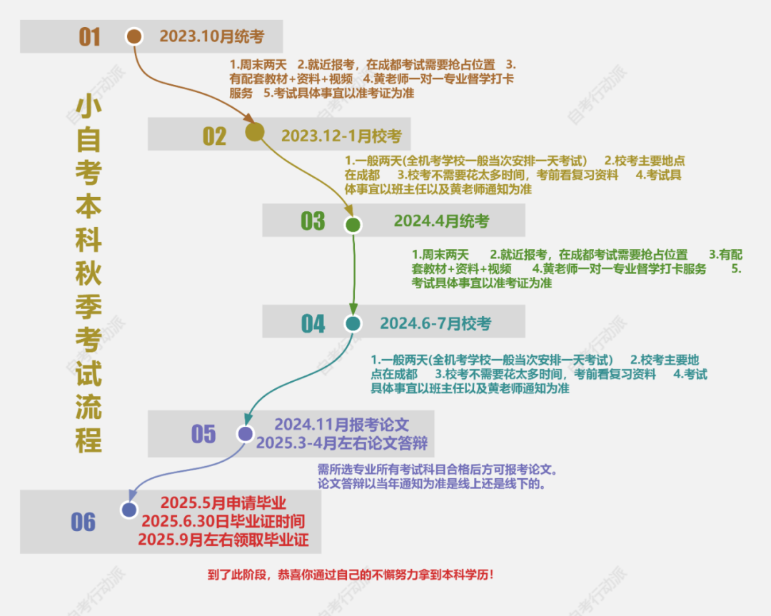 自由学习,通过线上平台进行学习,不需要线下面授学习,每年的4月、10月进行统考,小自考校考由学校统一安排,考完所有科目即可申请报考论文以及后续流程。