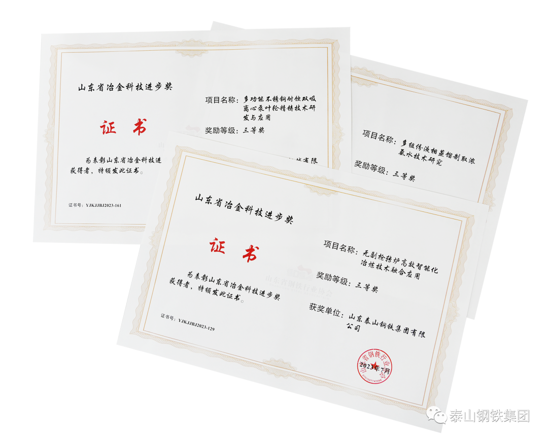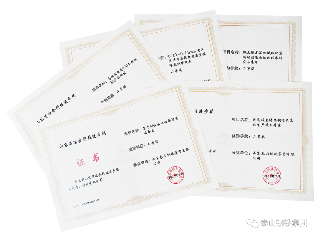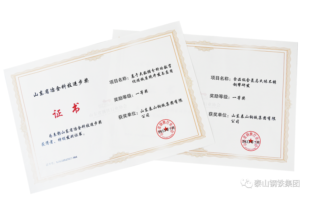 近日,山东省钢铁行业协会颁发“2023年度山东省冶金科技进步奖”证书,泰山钢铁集团十项科技创新成果获奖。其中,“基于大数据分析的数字化炼铁系统开发与应用”、“食品级含氮马氏体不锈钢带研发”荣获一等奖;“高端家电用430不锈钢2B产品研发”、“(0.10~0.14)mm 电子元件用高精度超薄宽幅冷轧钢带研制”、“优质碳素结构钢绿色高效生产技术开发”、“低氧低不溶物低松比高流动性还原铁粉技术研究与应用”和“基于AI技术的设备智慧云平台”获二等奖;“无副枪转炉高效智能化冶炼技术融合应用”、“多功能不锈钢耐蚀双吸离心泵叶轮精铸技术研发与应用”、“多组份液相蒸馏制取浓氨水技术研究”获三等奖。来源:泰山钢铁集团