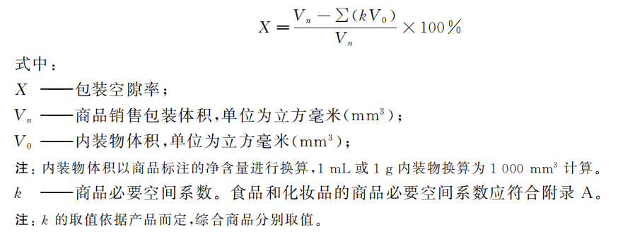 销售包装体积(Vn)、内装物体积(V0)、商品必要空间系数(k)确定后,即可计算出包装空隙率(X)。