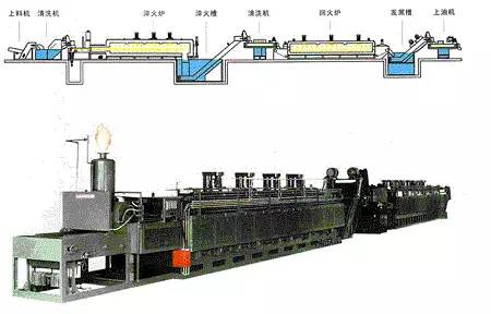 使用可控气氛保护,辐射管加热,炉底使用耐热钢辊棒传动,工件随升降台垂直降入油槽淬火;