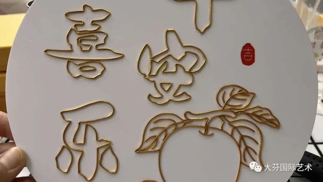 用各种颜色的金属丝线(主要是金色思丝线)把线稿全部掐丝,靓丽的颜色给人感觉豪华典雅