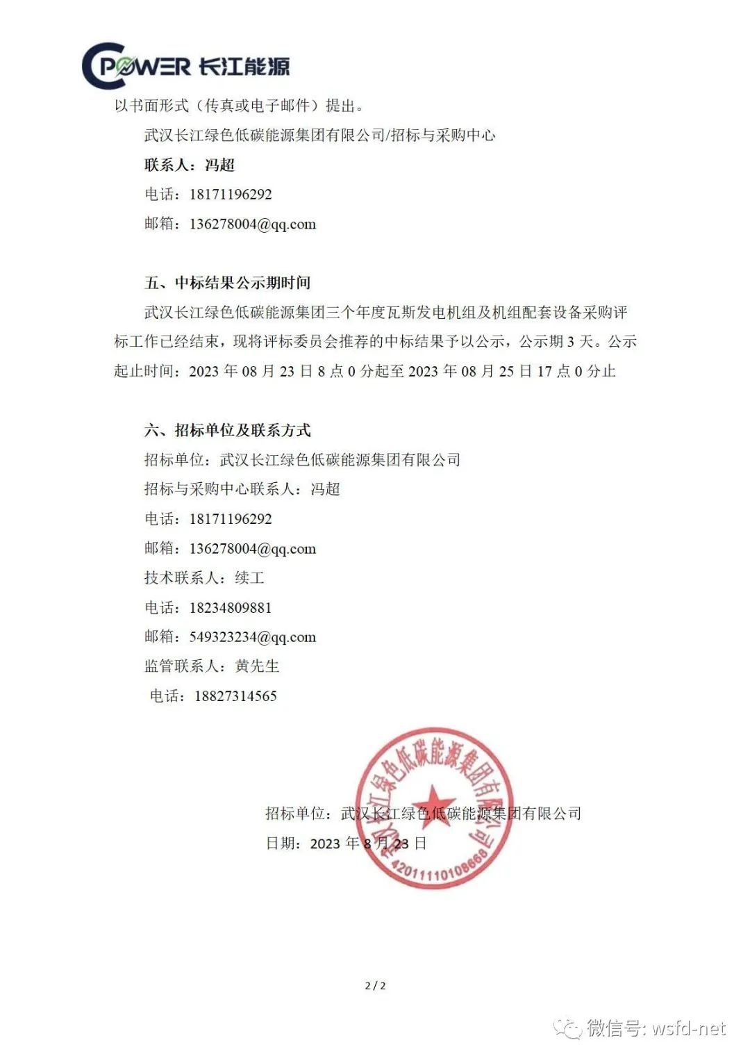 武汉长江绿色低碳能源集团有限公司/招标与采购中心联系人:冯超