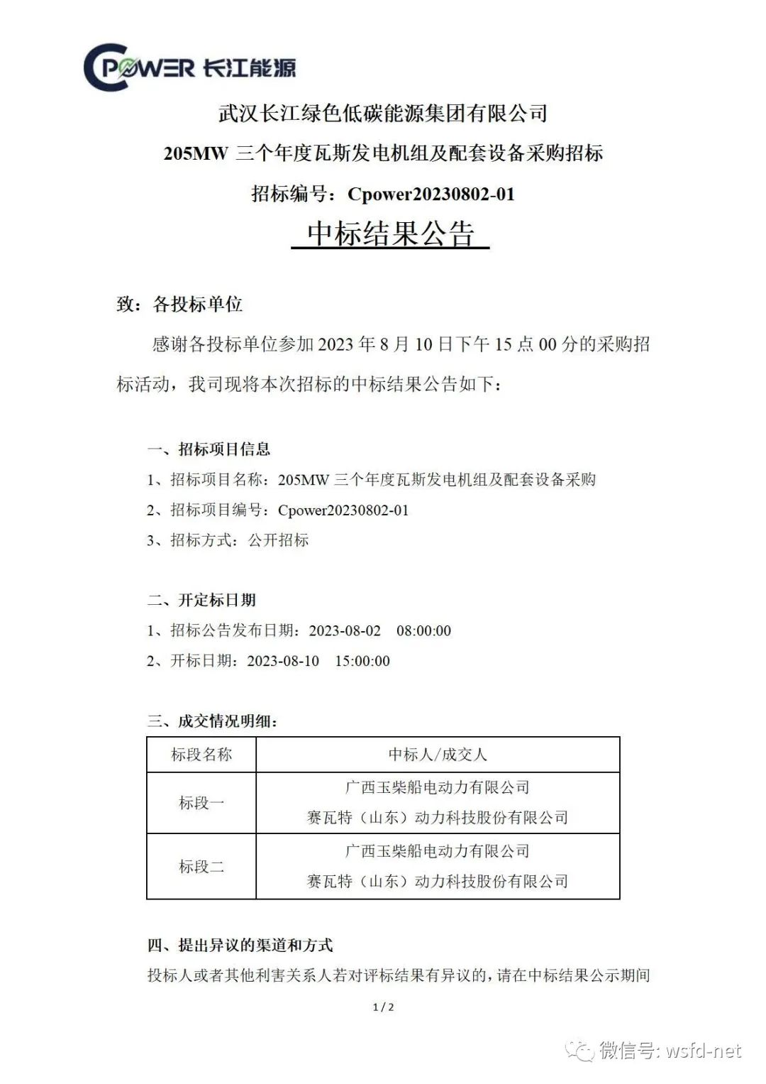武汉长江绿色低碳能源集团三个年度瓦斯发电机组及机组配套设备采购评标工作已经结束,现将评标委员会推荐的中标结果予以公示,公示期 3 天。公示起止时间: 2023 年08月23日8点0分起至2023年08 月25日17点0分止