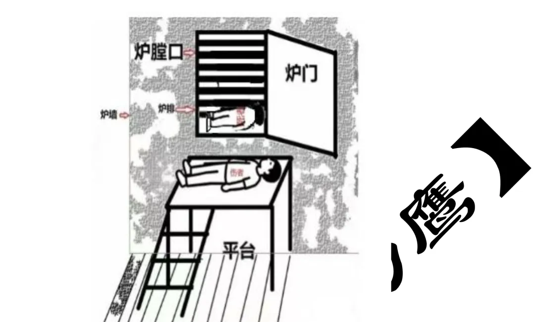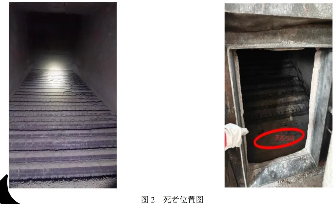 11时49分许,罗某强得知情况后拿着一副手套离开控制室前往1#锅炉炉膛处查看。11时50分许,罗某强到达1#锅炉炉膛口并拿了一个电筒进行观察,随后未佩戴安全帽、未佩戴隔离式呼吸防护器进入1#锅炉炉膛进行点火作业,张某在炉膛外配合。约1分钟后,在炉膛外的张某察觉异常,在炉门口向炉膛内查看,罗某强已经倒在炉膛内(图2)。张某试图用对讲机呼救,因身体不适于11时52分许倒在1#锅炉炉膛门前的操作平台上。