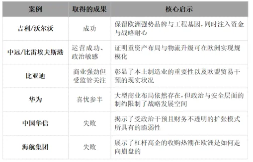 从中国企业拓展欧洲市场的整体历程来看,本土化治理、运营及合规是成功持续性的关键。这一规律也能解释为何吉利-沃尔沃、中远-比雷埃夫斯项目表现出较强的抗风险能力,而以中国华信、海航集团为代表的依赖债务驱动或政治风险敞口过度的案例,则沦为警示[5]-[10]。