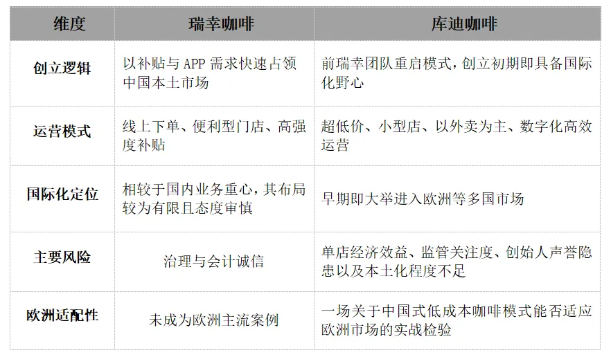 库迪咖啡可被视作一种全新模式下、面向消费端的前沿试验:依托极速扩张布局、应用程序驱动运营以及激进定价策略。该模式虽能快速实现市场试水,但也面临欧洲市场特有的风险——包括单店经济效益、创始人声誉遗留问题、合规管理以及文化适配等方面。与瑞幸咖啡相比,库迪咖啡从创立之初便更具国际化属性,同时在欧洲市场面临的监管风险与市场摩擦风险也更高。
