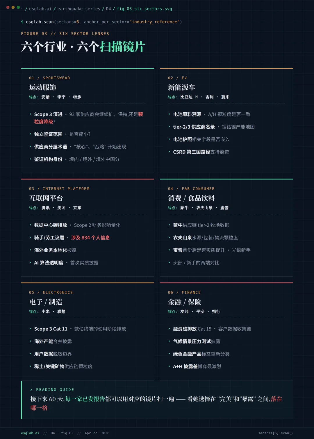 本文基于公开信息和公开文献的结构性分析,不构成任何法律、财务、投资或合规建议。文中对具体法规的描述以生效日期之前的公开文本为准,实际适用请咨询具备相应资质的专业机构。对具体公司的引用限于行业代表性的公开参照,不构成对其披露质量、合规状态或经营状况的评价。文中所述 "扫描镜片" 为 ESGLab.AI 的独立分析工具,不代表任何特定机构、企业或个人的立场。