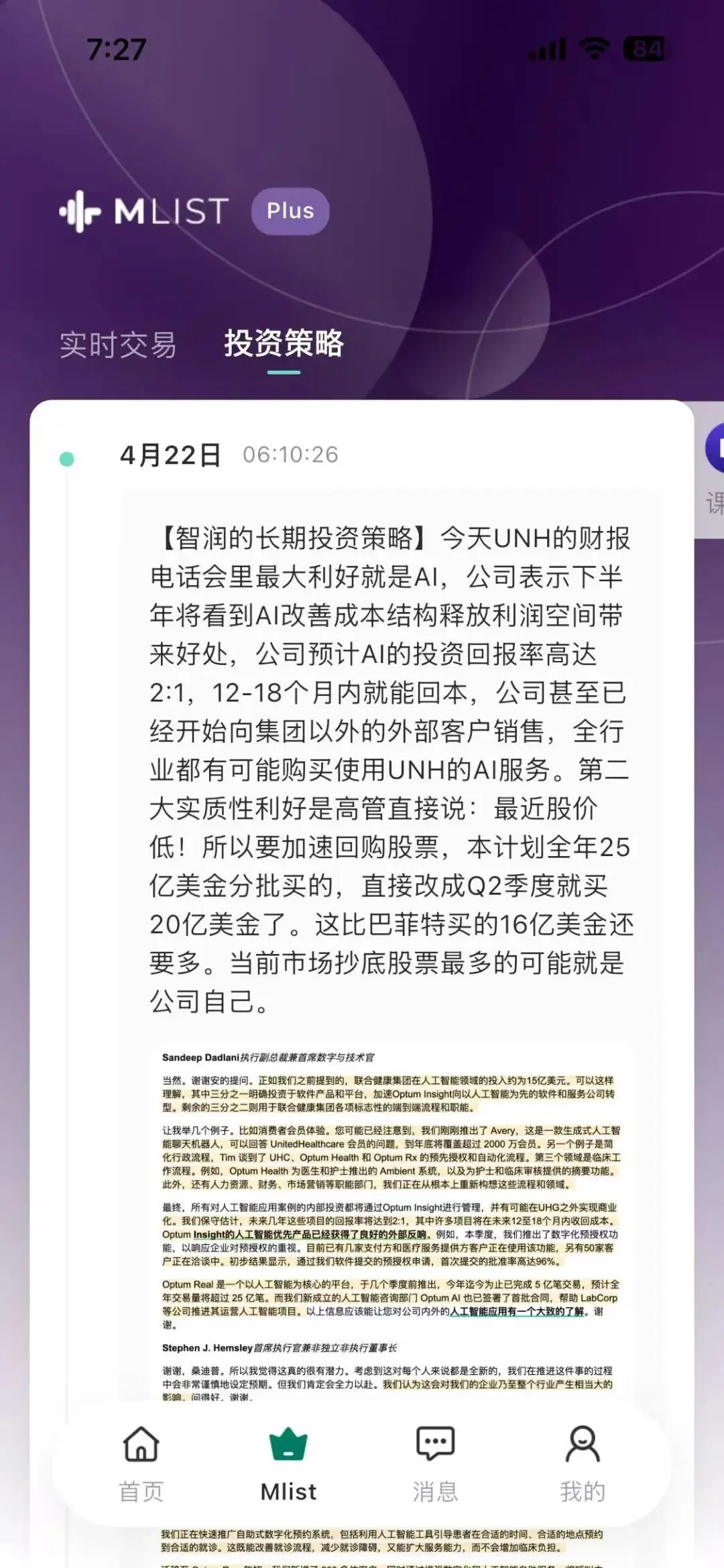我在最新的会员视频里分享了UNH最近看到的专家访谈的相关信息,讲过为什么UNH在AI变现上有很大潜力。今天的财报,管理层也验证了这一观点。专家访谈的一手信息之后留给付费会员们,但今天公开的内容,我摘录出来分享到下面了。