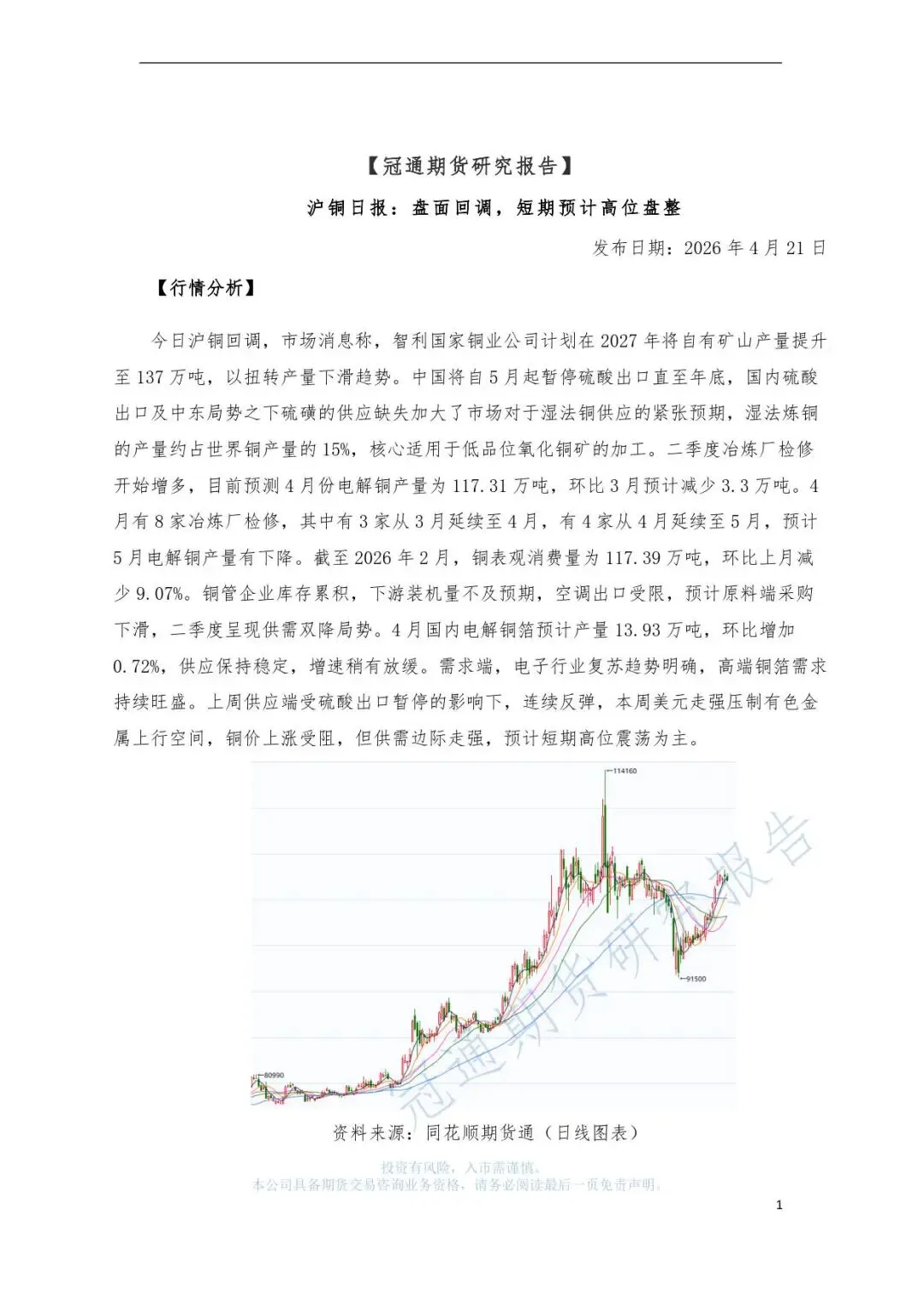 冠通期货研究报告--沪铜日报:盘面回调,短期预计高位盘整