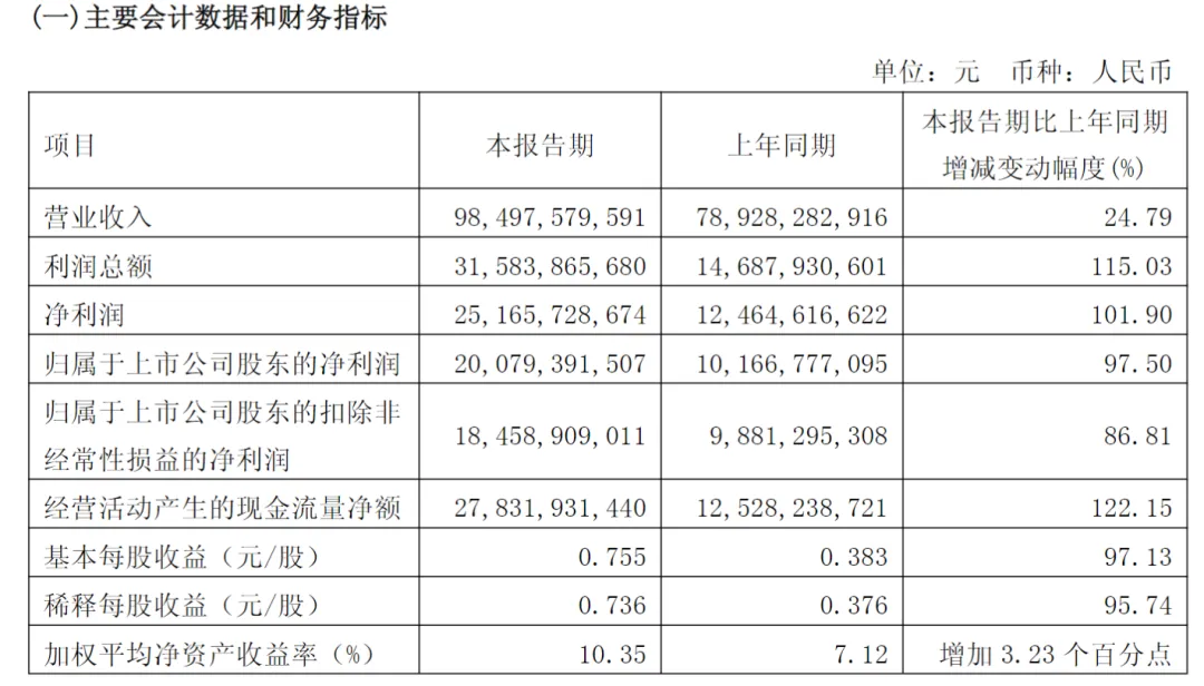 报告期,公司持续贯彻“提质、上产、控本、增效”工作总方针,核心财务指标再创历史新高:实现营业收入985亿元,同比增长25%,归母净利润201亿元,同比增长98%,经营活动产生的现金流量净额278亿元,同比增长122%。直接引用东方财富的图解财报: