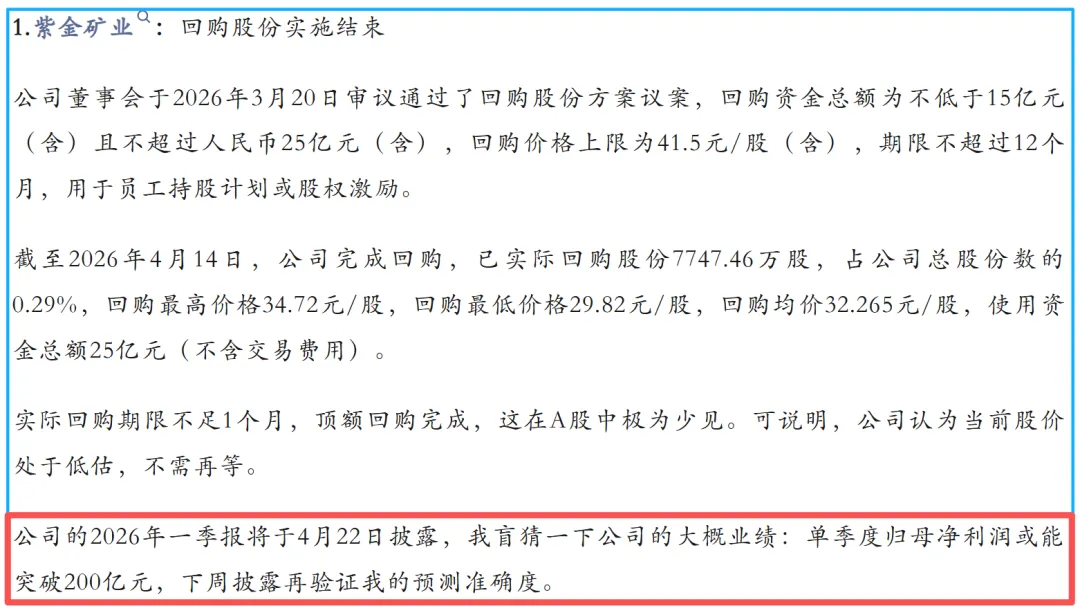 2026年4月21日,紫金矿业披露了第一季度财报,实现归母净利润200.79亿元,与我在《投资小结:聊聊德业股份|复盘深度跟踪标的(第127期)》中预测200亿元几乎一致,值得我嘚瑟一下!大家就不要太崇拜了哈,本文存在很高的吹牛成分,请谨慎阅读。