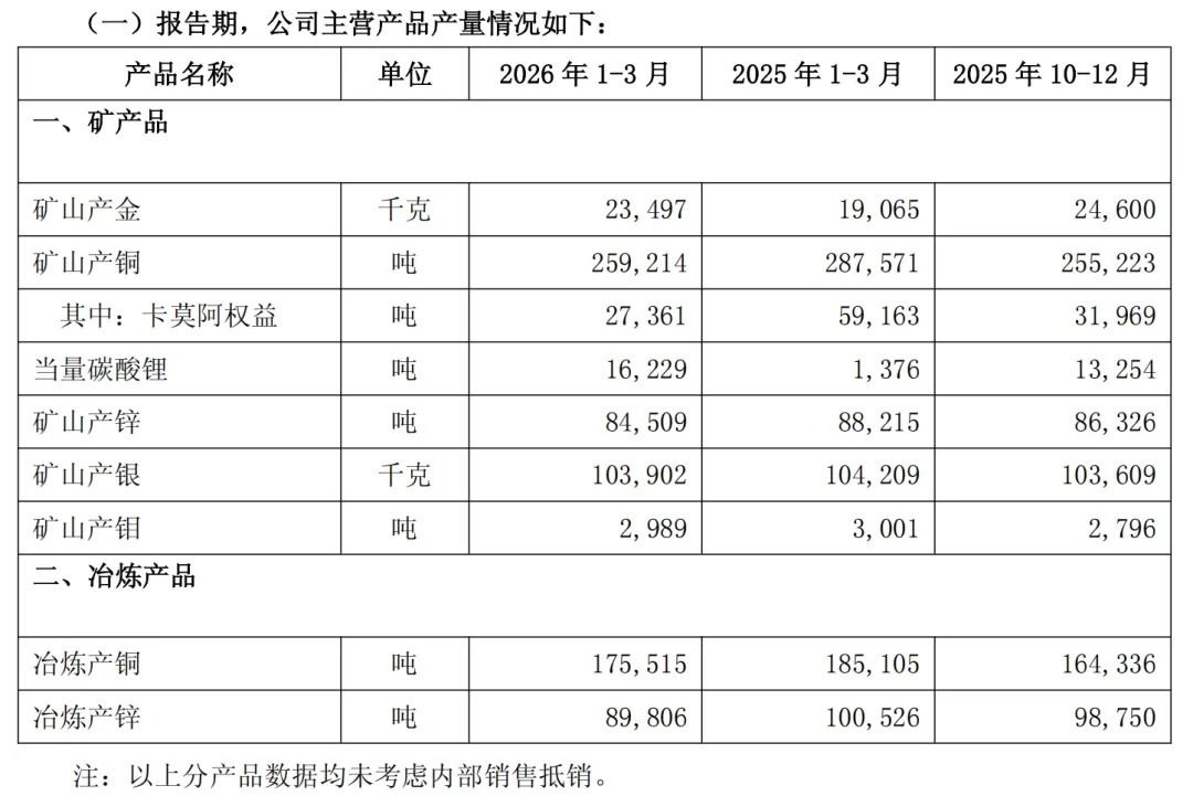 铜:实现矿产铜26万吨,扣除卡莫阿-卡库拉铜矿减产影响,其余矿山均按照全年计划产量有序推进,巨龙铜矿二期自2026年1月下旬投产以来产能持续爬坡,一季度矿产铜6万吨。